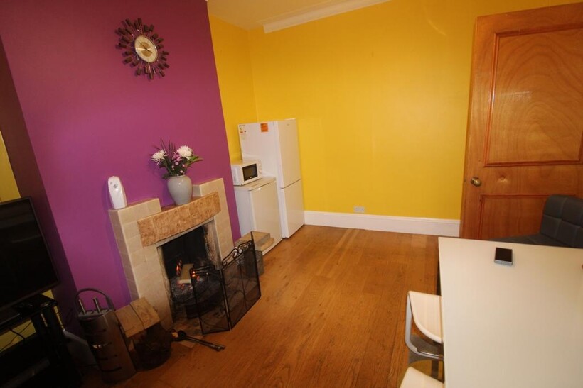 SHARED DINING ROOM: 12'10" x 10'9" (3.91m x 3.28m), Patio doors to garden. Fridge freezer. Feature fireplace. Radiator.