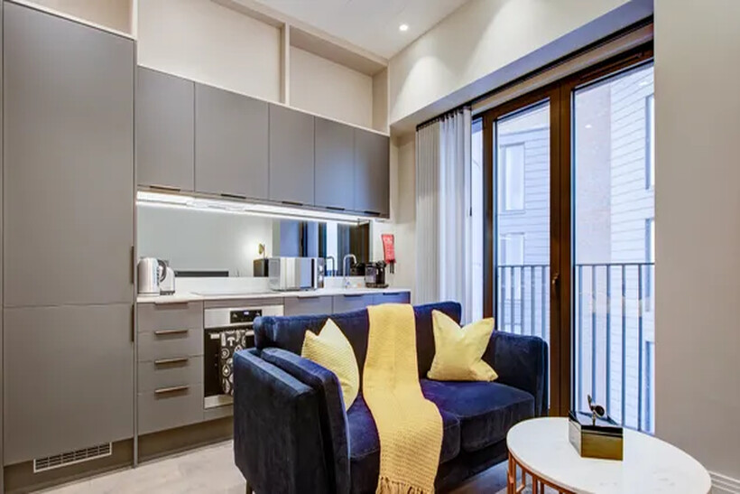 This one-bedroom apartment features a Double bed with a Hybrid office desk & an executive chair, a bathroom, a living area with wooden flooring, and a fully equipped kitchen with an oven, hob, microwave, fridge freezer, dishwasher, and Washing machine. Apartment facilities include a dining area, Smart TV, and free internet access