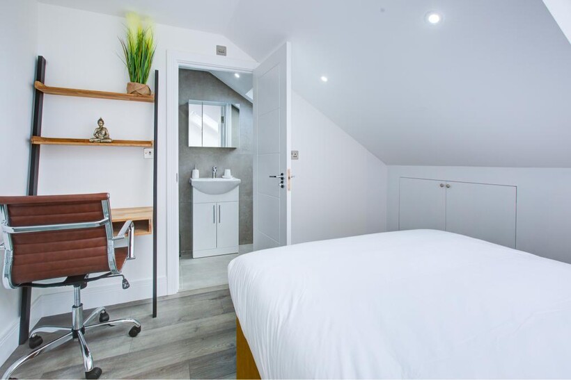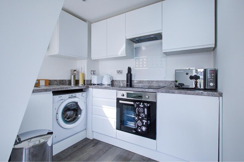 This cozy one-bedroom apartment features a Double size bed with a Hybrid office desk & an executive chair, bathroom, a living area with wooden flooring, and a fully equipped kitchen with an oven, hob, microwave, fridge and Washing machine. Apartment facilities include a dining area, Smart TV, and free internet access