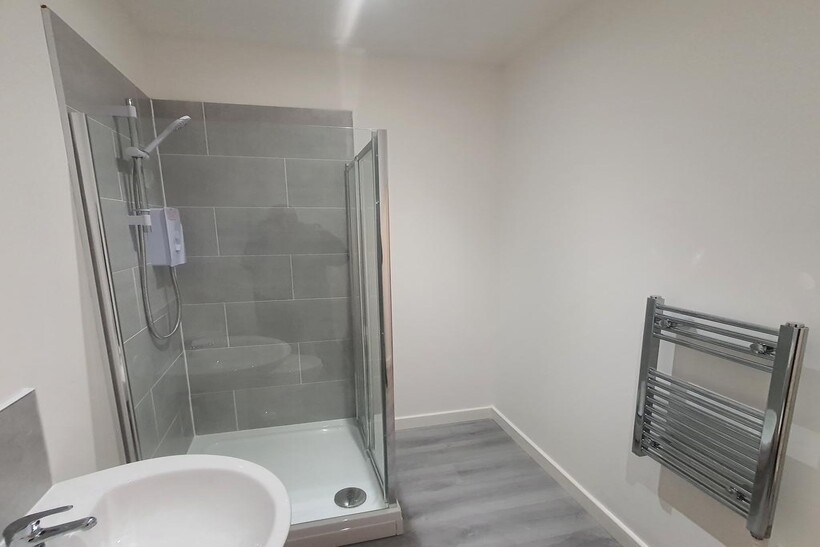 Stylish and modern white suite shower room comprising of a shower cubicle, low level WC, pedestal hand wash basin, extractor fan and a towel warmer.