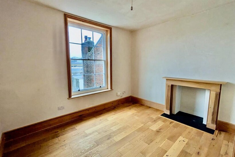 The master bedroom with feature fireplace, offers a quiet retreat away from the hustle and bustle of town life, whilst the living area’s two large sash windows gives lovely views to the sea and Square.