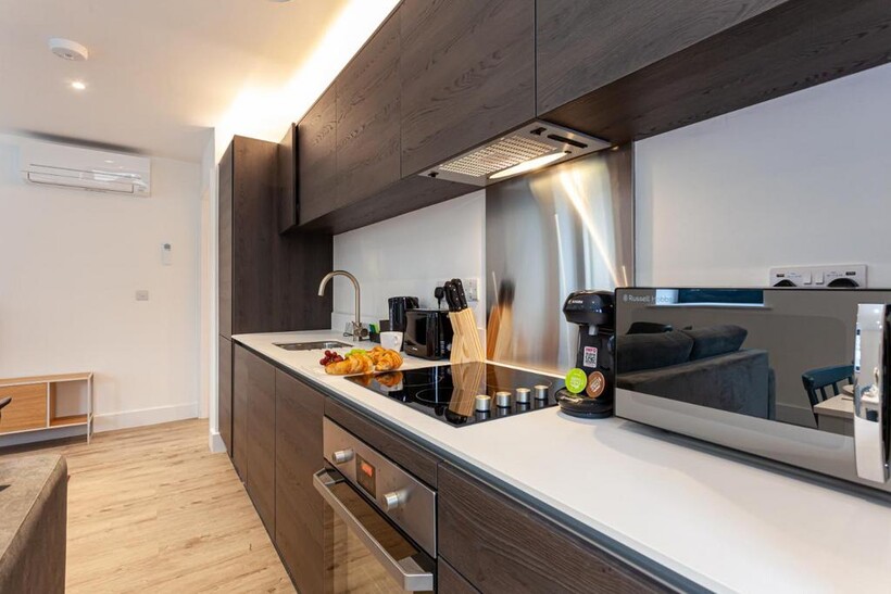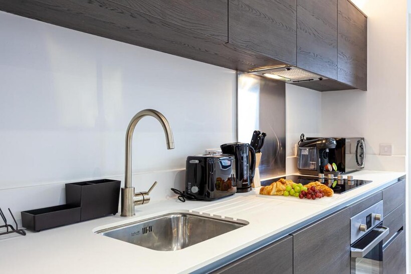 The open-plan layout ensures every part of this luxury apartment is appreciated. The lateral living room is bright with windows running across both walls. The fully equipped kitchen is fitted with dark oak cupboards and a modern white stone worktop to contrast