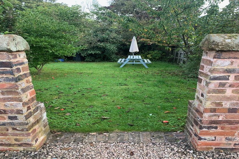 Opposite the front door is the pretty cottage garden, laid to lawn with a garden bench.