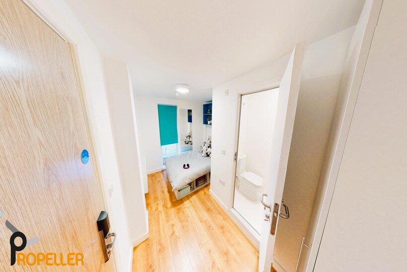 Our ensuite rooms at The Cube are fully furnished with a small double bed, complete with underbed storage, wardrobe, full length mirror, individual study area and private bathroom.Offered as part of a 6 bed flat, the ensuite rooms share a cosy living space, along with a modern kitchen equipped with fridge-freezer, oven, hob and microwave.