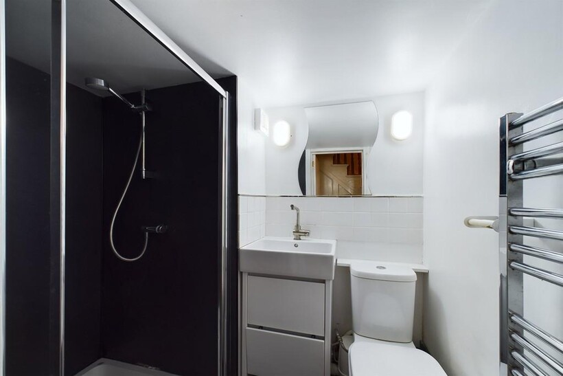 Also on this level, you will find a high-quality modern shower room with WC for exclusive use by the ground floor occupants, finished to a sleek contemporary standard. To the rear of the property, the expansive open-plan living area serves as the heart of the home. This generous space seamlessly combines the dining, lounge, and kitchen areas, making it perfect for socialising or unwinding after a long day. The dining area includes a large table and comfortable seating, while the lounge is centred around a striking cast-iron fireplace, above which a large flat-screen TV is mounted. The Virgin Media Internet package is included within the rent, adding extra value for tenants.