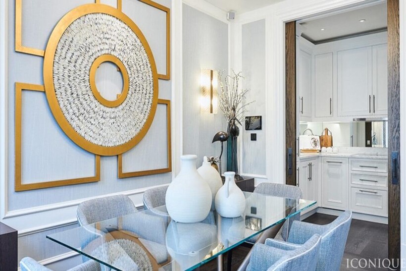 - Sophisticated reception room and open-plan kitchen: Featuring paneled walls, a chandelier, and a coffered ceiling with ornate up-lighting, opening onto the private terrace