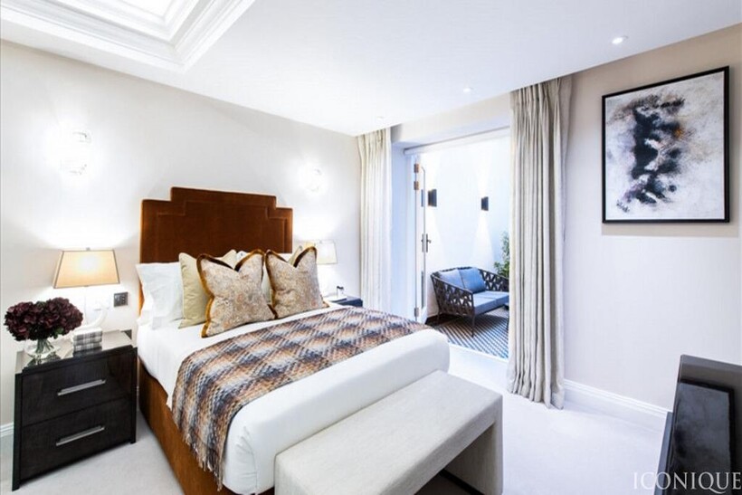 Primary bedroom: Includes built-in wardrobes, a marble en-suite bathroom with underfloor heating, integrated demister mirror-fronted cabinets, and direct access to the private courtyard