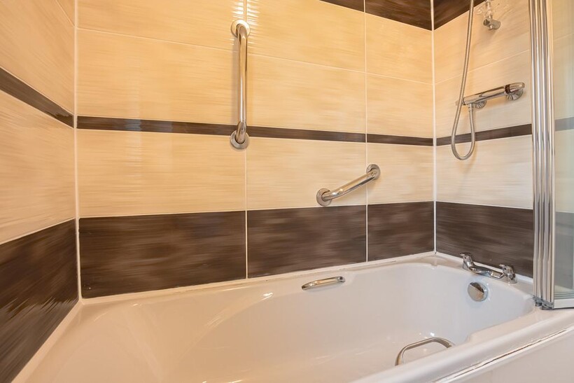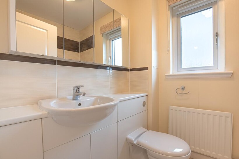 FAMILY BATHROOM This generously sized family bathroom features a fully integrated vanity unit, including a sink and toilet. A row of mirrored storage cabinets offers excellent storage options. The bathroom also benefits from a shower over the bath, along with a privacy window for added comfort and light.