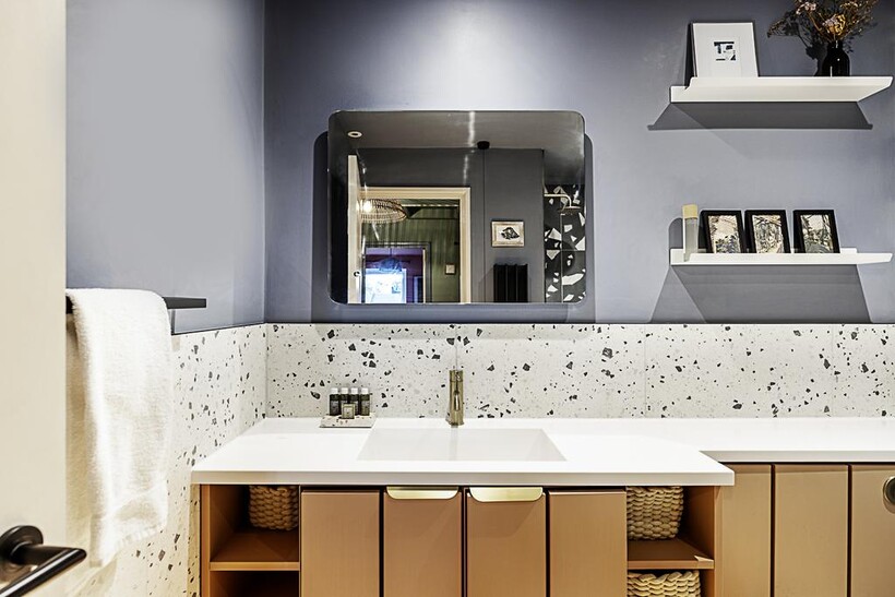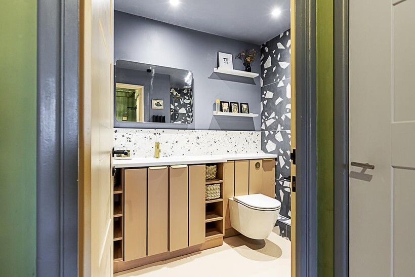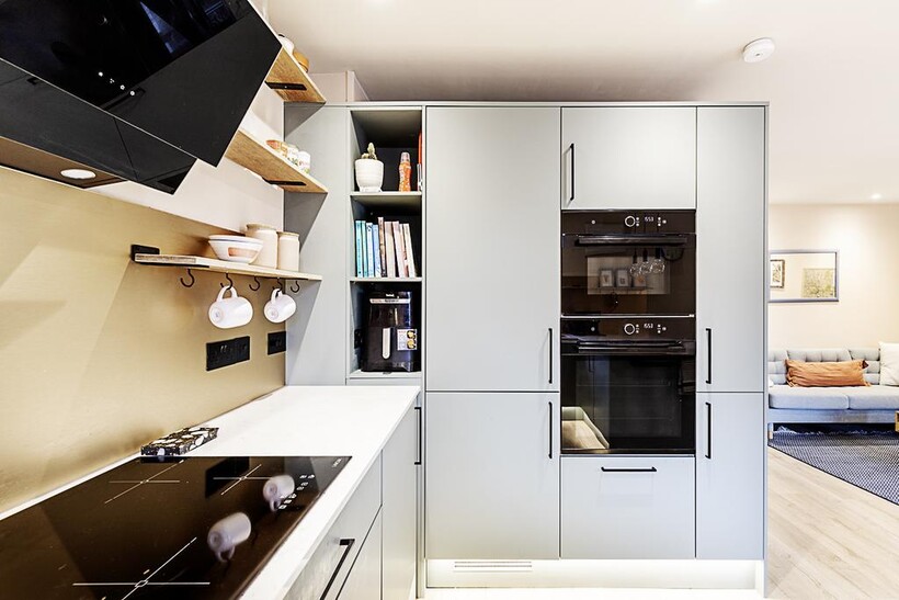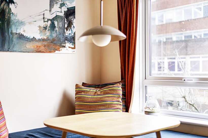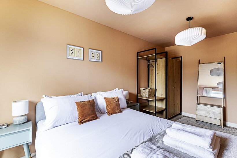 Inside, you'll find a cosy living area furnished with a comfortable sofa and a smart television, perfect for relaxing after a day of exploring the city. A separate dining area comfortably seats four, ideal for enjoying meals together. The modern kitchen is fully equipped with contemporary appliances, including a Nespresso coffee machine, an air fryer, and a dishwasher, ensuring a seamless and convenient stay. The apartment is decorated in a cheerful and modern style, creating a warm and inviting ambience.