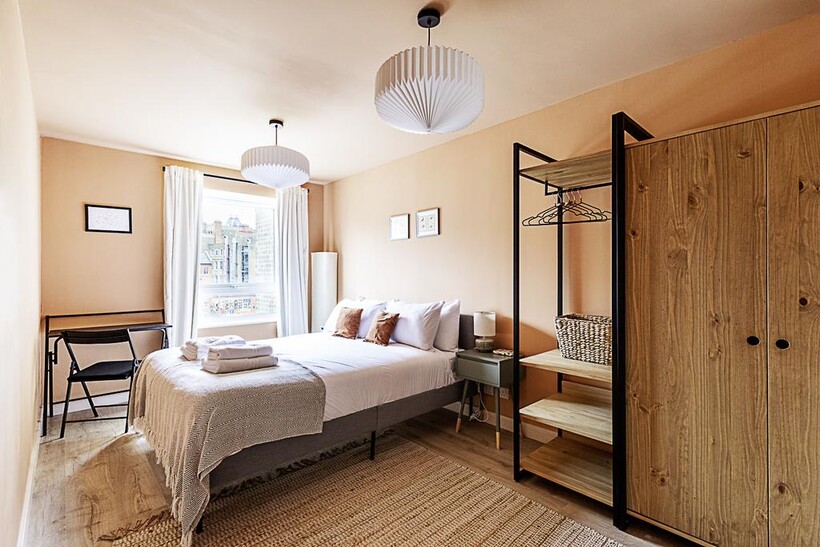 The property features two bedrooms, comprising a king-sized bed and a double bed, accommodating up to four guests. There is one bathroom fitted with a shower. The apartment is located on the second floor of a traditional London building and comes with an allocated parking space in a private car park.