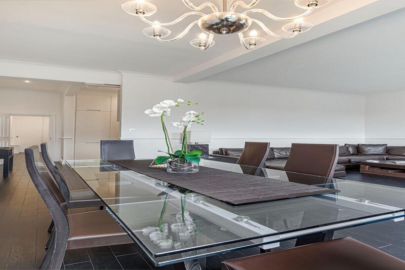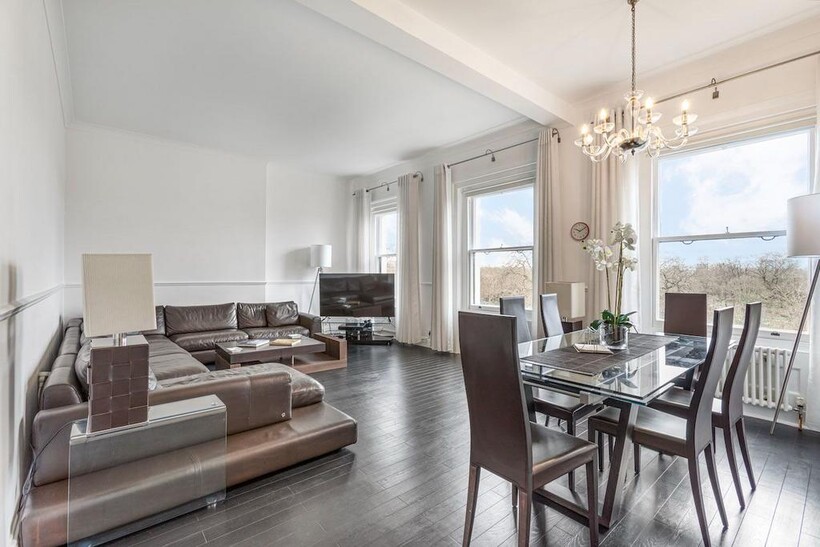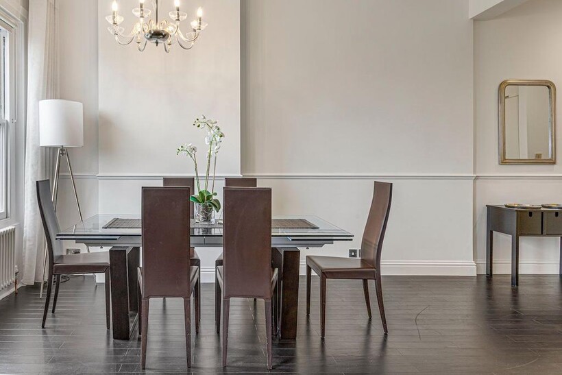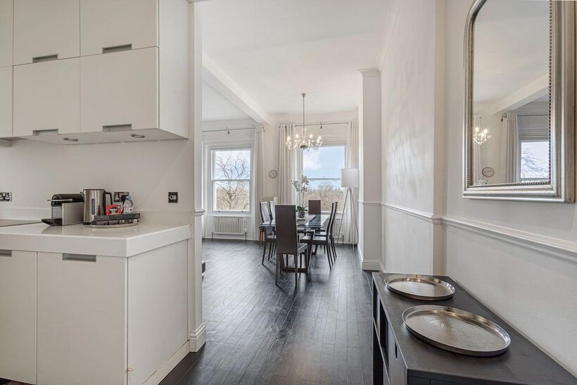 The property boasts stunning views of Hyde Park, creating a serene and picturesque backdrop. The apartment features a spacious open-plan reception room with a dedicated dining area, perfect for both entertaining and relaxation. Adjacent to the living space is a separate, well-appointed kitchen, thoughtfully designed to meet modern lifestyle needs.