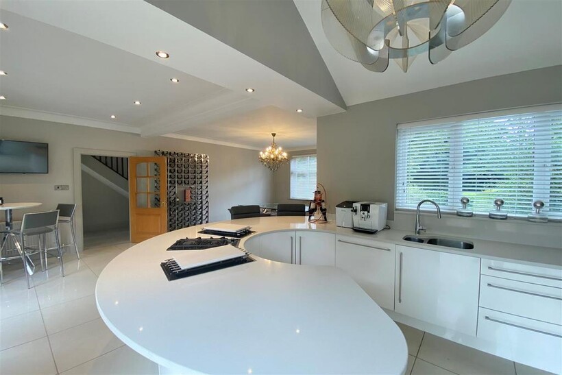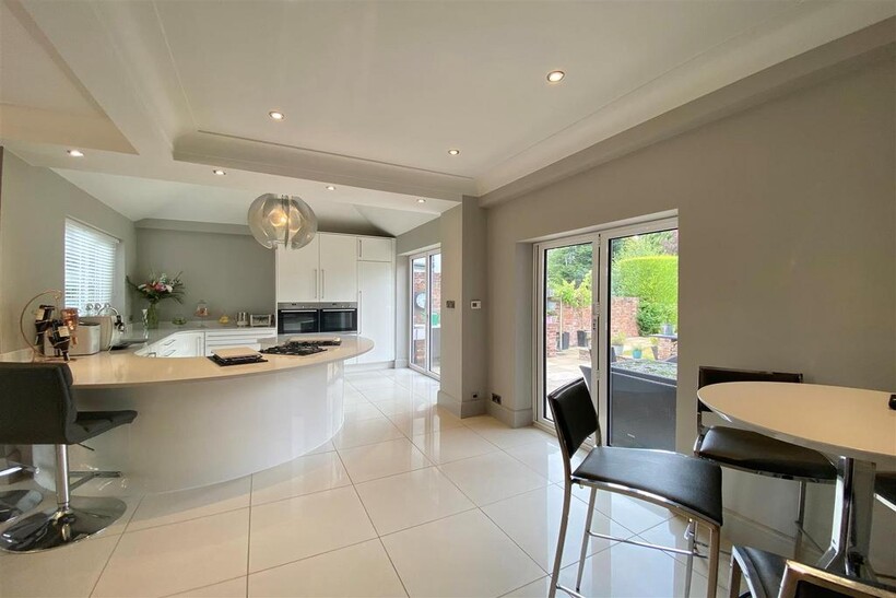 Living Dining Kitchen - 7.04 x 5.16m (23'1" x 16'11") - A bespoke fitted kitchen with ample base cupboards and drawers, Granite work surfaces with curved breakfast bar, gas hobs, two split level Neff electric ovens, integrated fridge, integrated dishwasher, tiled floor, recessed lighting, central heating radiators, pvc double glazed windows and bi-folding doors opening to the garden.