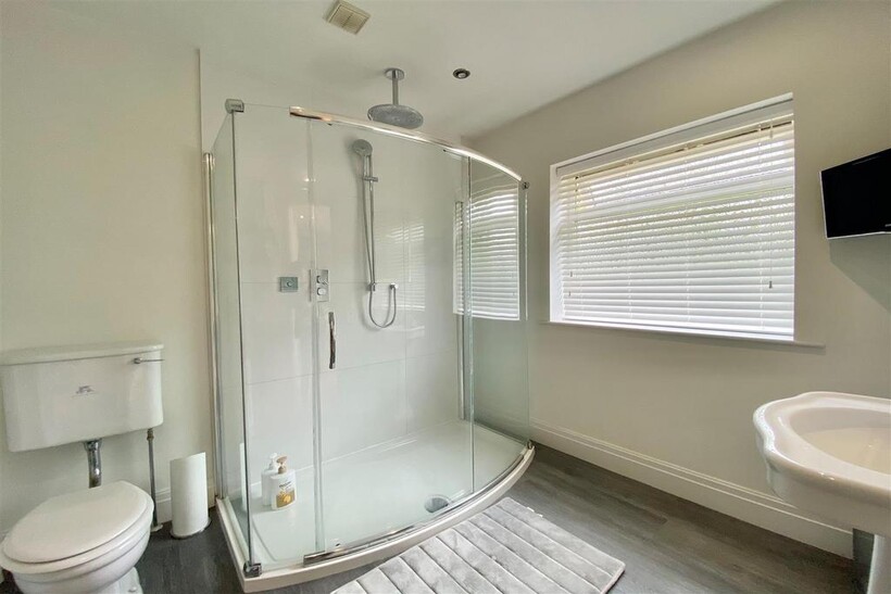 En-Suite Shower Room - 2.72m x 2.44m (8'11 x 8'0) - A large walk in shower cubicle, close coupled wc, pedestal wash hand basin, pvc double glazed rear window, central heating radiator, pvc double glazed rear window, TV point and wood effect flooring.