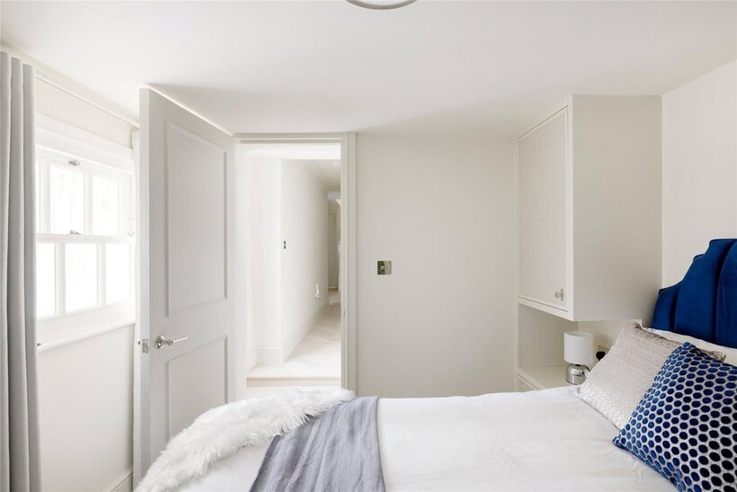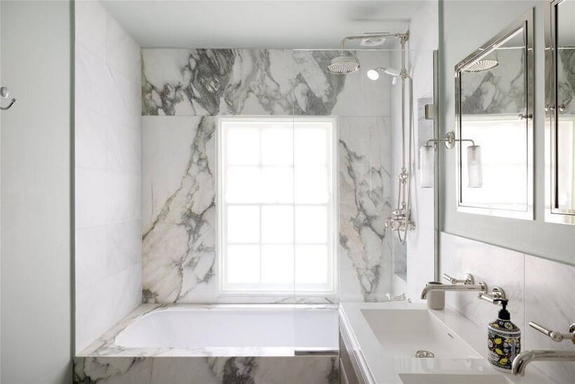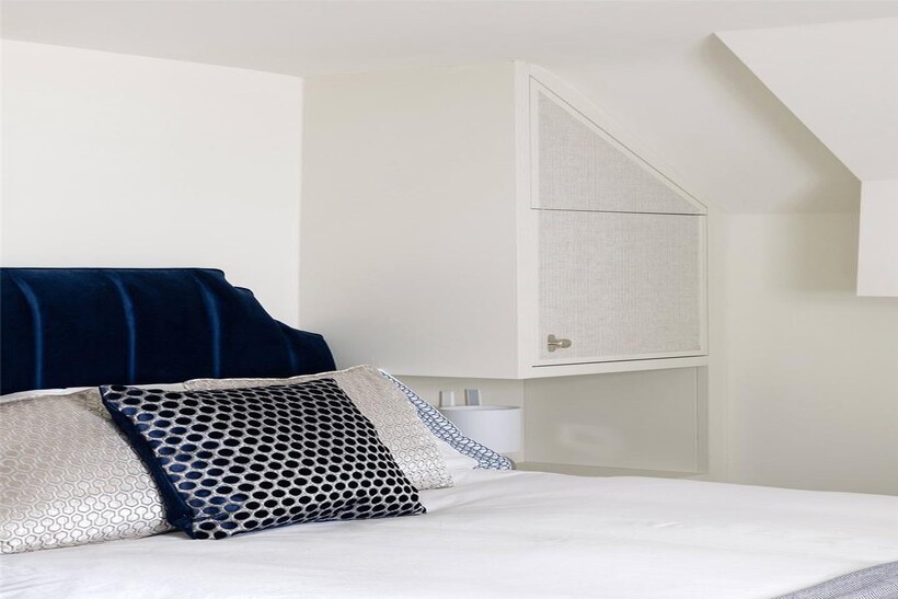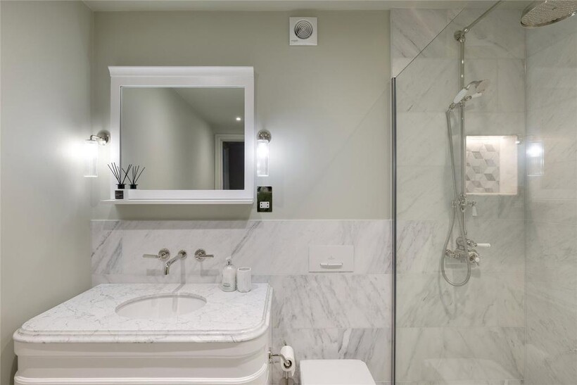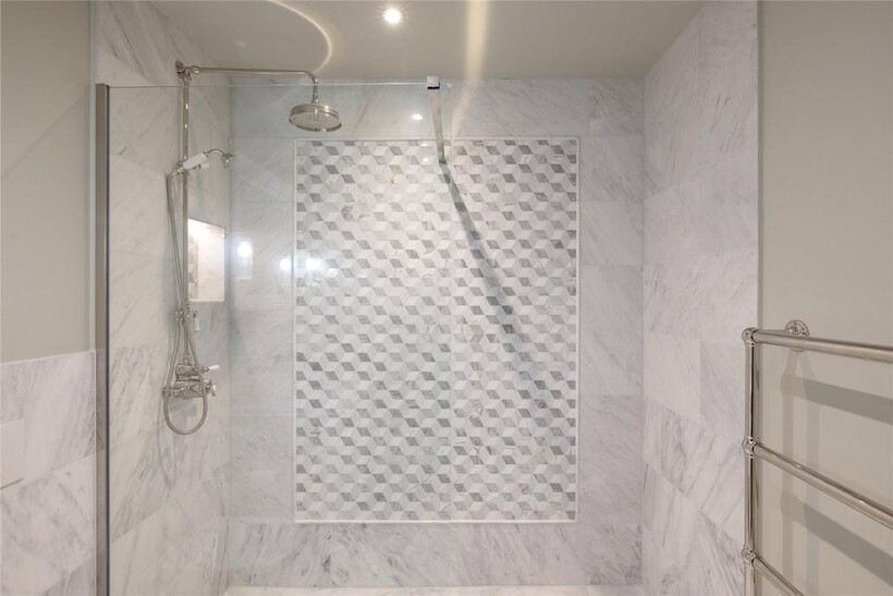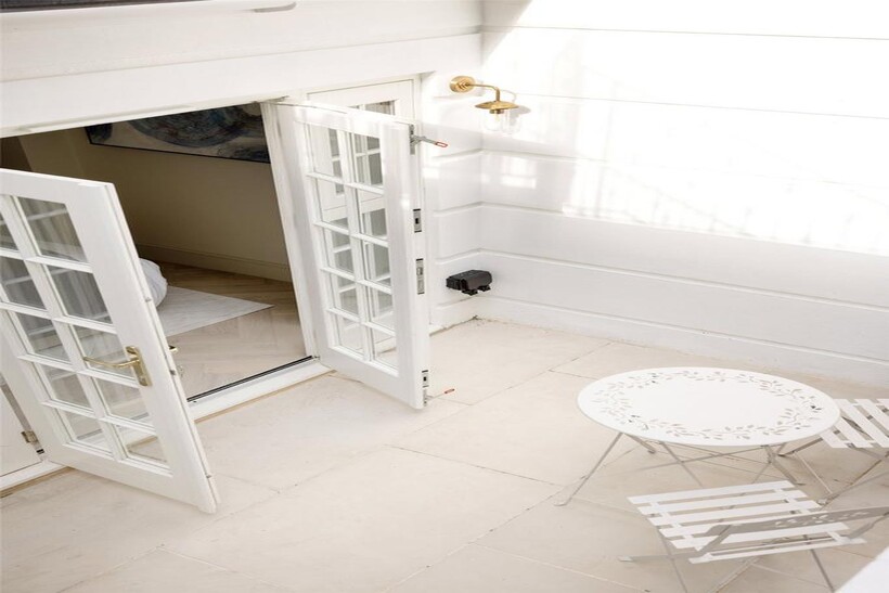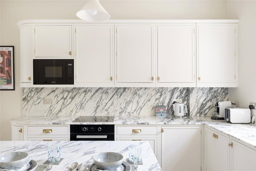 Light cascades through the dual-aspect layout, illuminating the centrepiece of the space: a striking Italian marble kitchen. Integrated Miele appliances elevate the culinary experience, while the breakfast bar invites morning coffee or evening aperitifs. A discreet yet sophisticated storage room leads outside: one door opens to a decked terrace, the other to steps down to the south-facing garden.