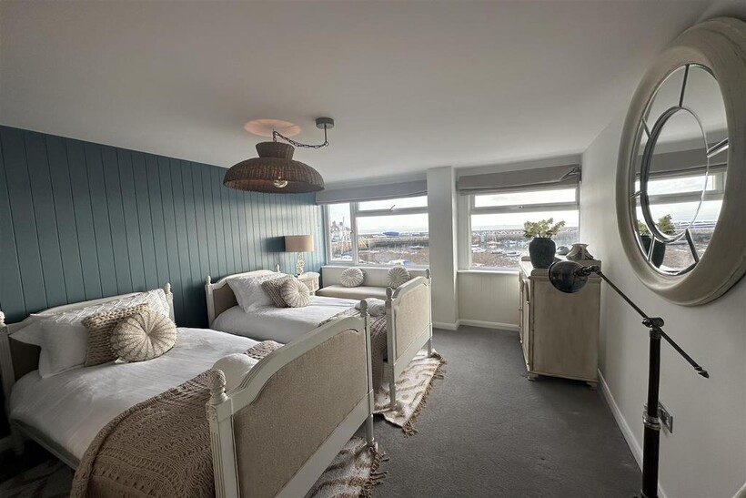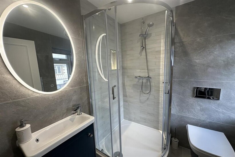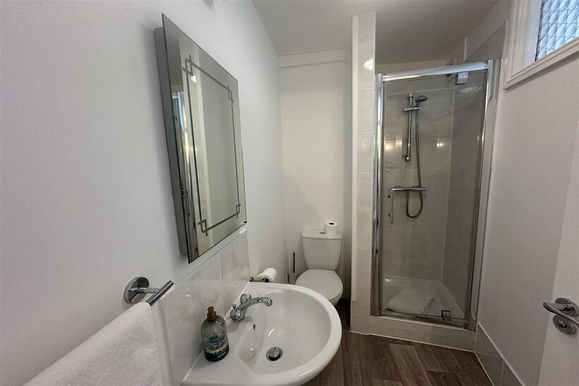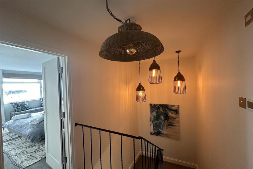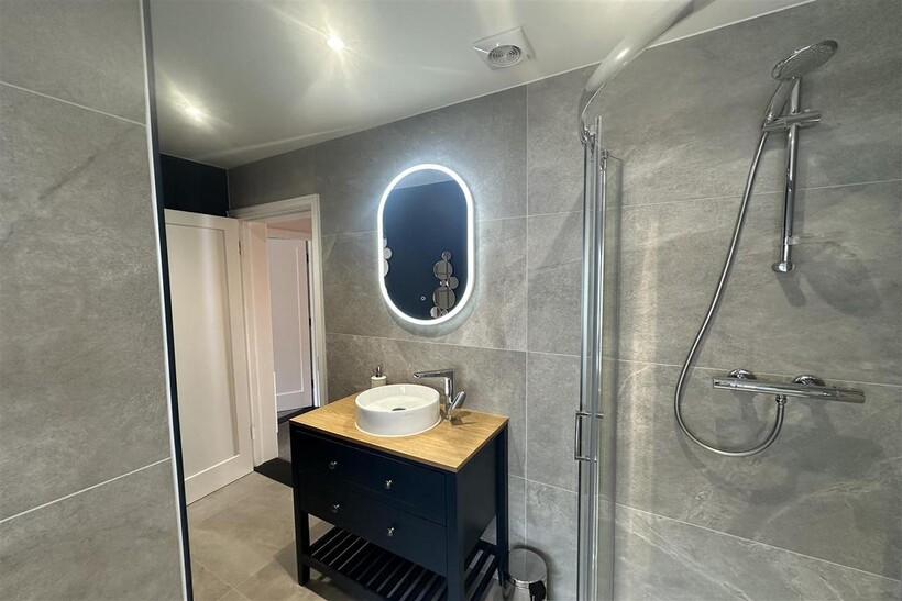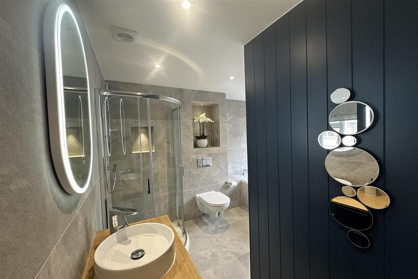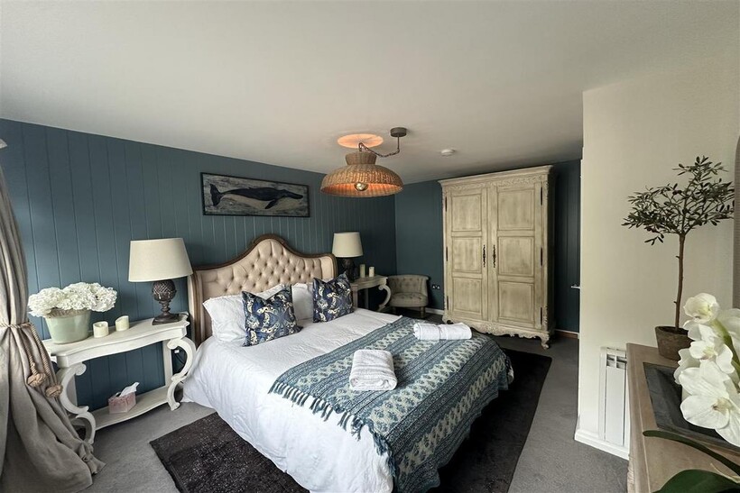 Upstairs, the property boasts three well-appointed bedrooms, one of which has a modern en-suite bathroom, all filled with natural light. The main house bathroom is stylishly finished and offers views of the surrounding area.