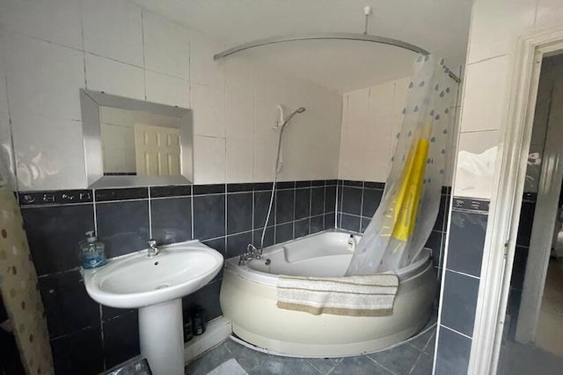 Multiple Bathrooms: A ground-floor bathroom with a corner bath and shower, plus a second bathroom on the first floor.