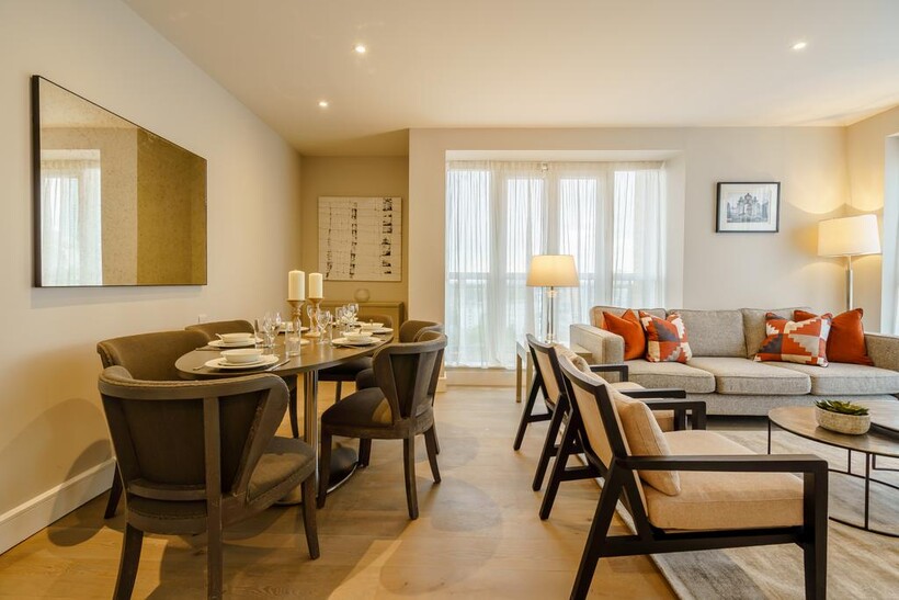 E14 8RW - 10th floor - 2 bedrooms - 988sq ft - 2 bathroomsThis luxurious, interior-designed two-bedroom, two-bathroom apartment occupies 988 sq ft on the tenth floor of a waterfront estate. Fully furnished with light oak wooden flooring throughout, the modern open-plan living area features a dedicated dining space and floor-to-ceiling windows that flood the apartment with natural light. A private balcony offers dramatic views of the Canary Wharf skyline.The separate, fully equipped kitchen comes with stylish LED under-cabinet lighting, full-sized fridge/freezers, electric ovens with gas hobs, a microwave, external extractors, dual sinks with food waste disposal, a dishwasher, and a washer-dryer. The primary bedroom boasts a marble en-suite bathroom, while a second family bathroom serves the additional bedroom. Both bedrooms are spacious, featuring king-size beds and bespoke fitted mirrored wardrobes. Ideally positioned with easy access to Zone 2 stations—including Westferry (DLR), Canary Wharf (Jubilee), and Crossrail (Elizabeth Line)—this apartment offers excellent connectivity alongside nearby riverside walkways and local bus services.