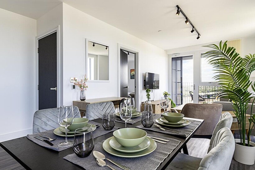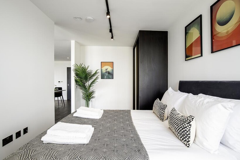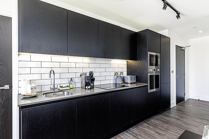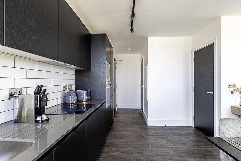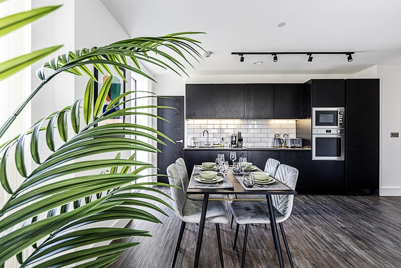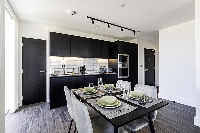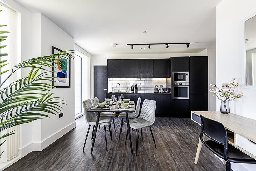 The heart of the apartment is the open-plan living area. Relax on the comfy sofa while watching your favourite shows on the smart TV, or enjoy a meal at the dining table that comfortably seats four. The sleek black kitchen is fully equipped with everything you need to prepare delicious meals, including modern appliances and ample counter space.