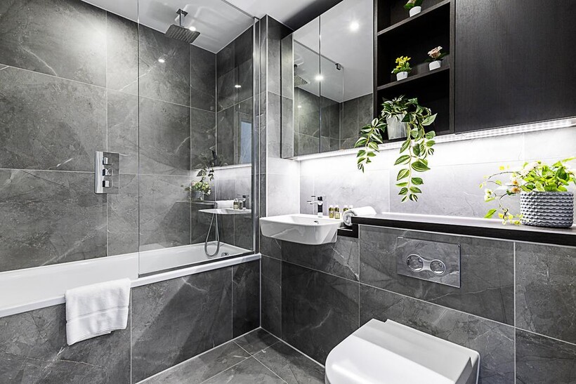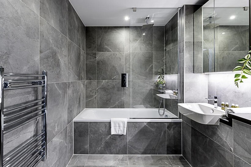 The spacious and bright bedroom features a super king-sized bed that can be easily split into two single beds, accommodating different sleeping preferences. You'll also find a chic dressing table and modern decor. The sleek and modern bathroom is equipped with a bathtub and overhead shower,