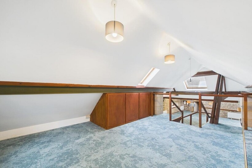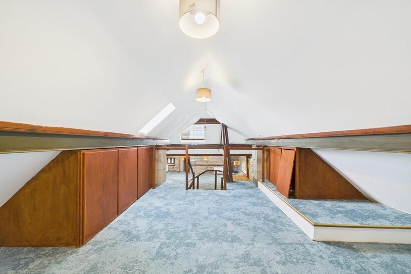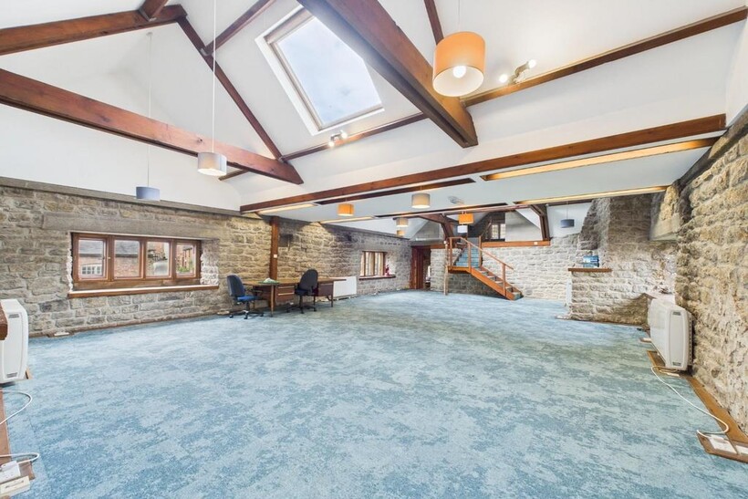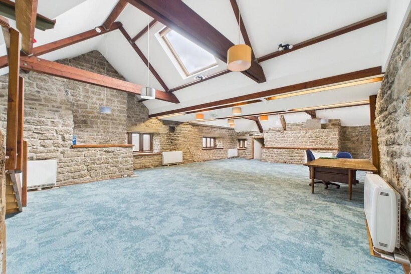 Main Office - 11.57 x 6.96 (overall) (37'11" x 22'10" (overall)) - An exceptional space that would lend itself to a variety of uses. With exposed timber and stone work and with mullioned windows to the front and rear aspect. The floor is fitted with soundproof flooring and brand new carpet. Heating is provided by electric wall heaters. Size = 680 sq ft (net internal area). A wooden staircase rises to reach the