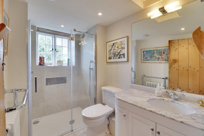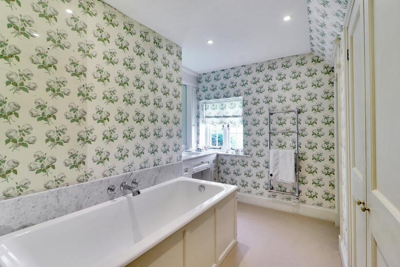 From the entrance hall the staircase rises to the first floor and, on one side, to the main bedroom, with dressing room and bathroom. The other side of the stair leads into bedroom 5, with en suite bathroom and a connecting door opening into bedroom 3. The second staircase leads up to a landing which gives access to bedroom 2 with an en suite bathroom. The landing also connects to the family shower room and to bedroom 3 and 4.