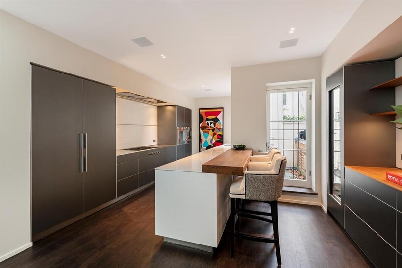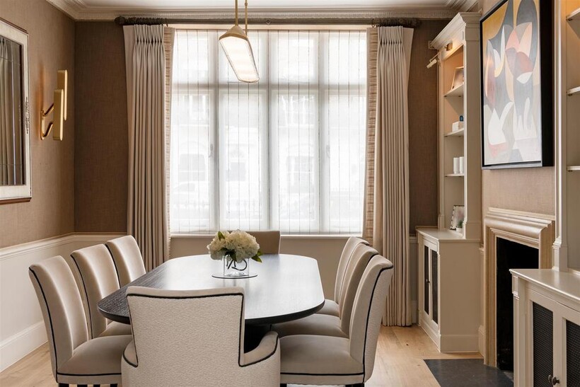 This stunning Knightsbridge townhouse offers an outstanding standard of accommodation that has been lovingly restored and improved by the current owners. At ground floor level, you have a open and bright reception area that sits in between the kitchen to the rear and the dining room to the front. The kitchen, designed and fitted by Bulthaup has Gaggenau appliances along with ample built in storage. A small terrace is to the rear also that along with a skylight floods the space with light. The dining room is a bright space with sash windows to one side and a central fireplace. A large dining table currently sits centre of the room that easily hosts ten people.