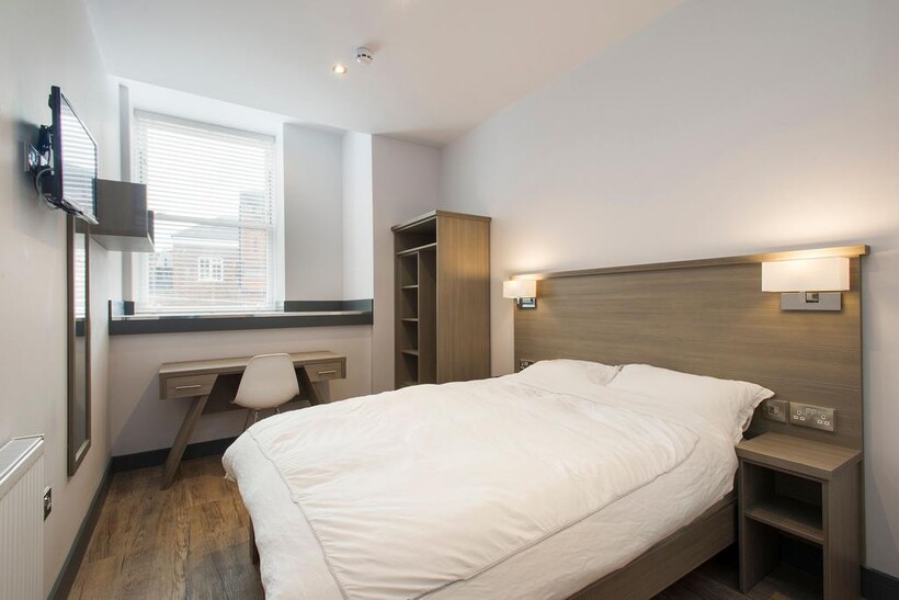 Each of the six double bedrooms benefits from grey wooden furniture including double bed, desk, chair, wardrobe, shelf, bedside table, bedside light and wall mounted TV.