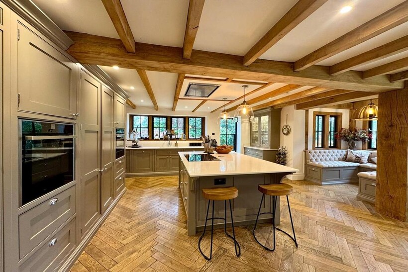 The lower ground floor of the home boasts a beautiful open plan kitchen dining room with doors opening onto the patio, utility room and formal living room with an open fireplace.
