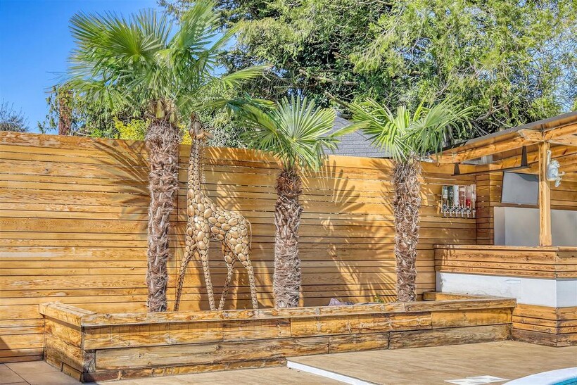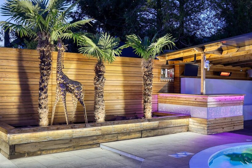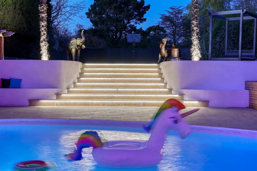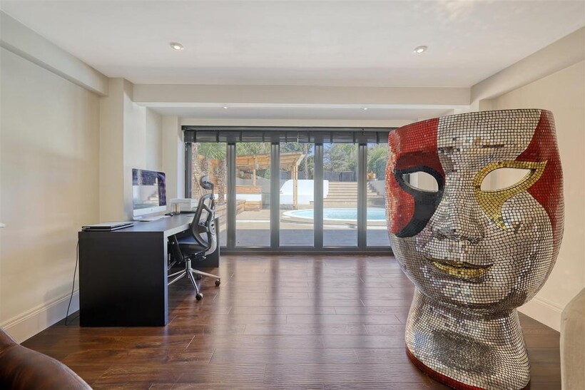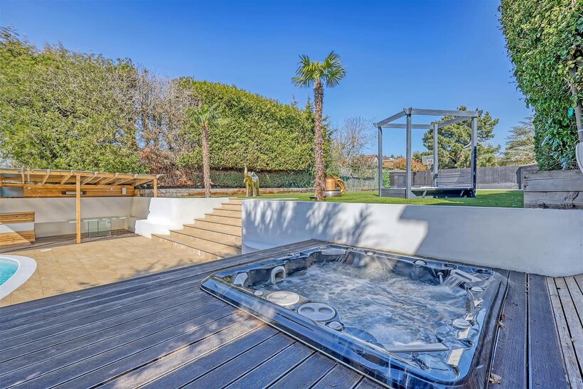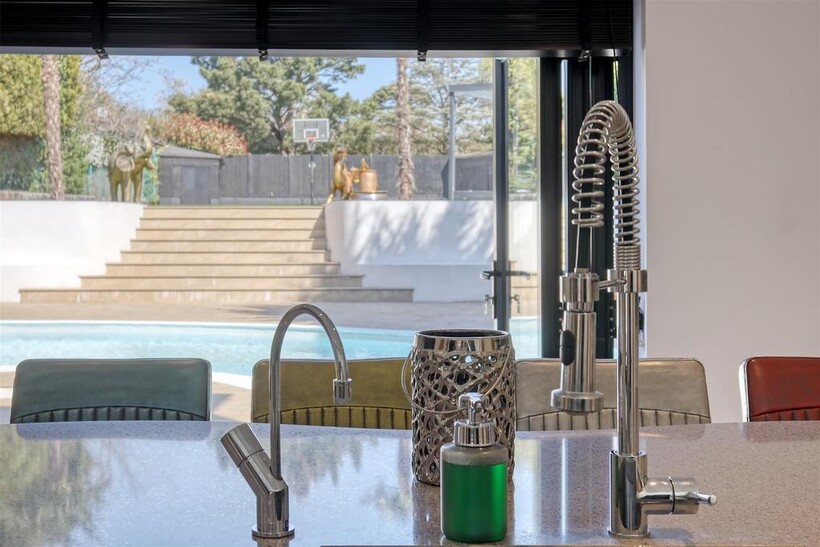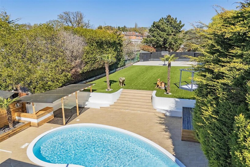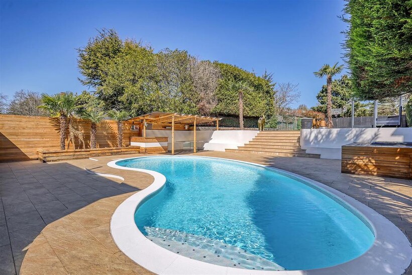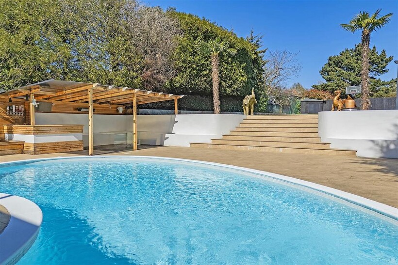 Step outside to discover a haven of relaxation and entertainment, with a luxury garden that includes a sparkling swimming pool and a sophisticated bar area. Ascend the steps to a meticulously manicured lawn, surrounded by mature shrubs, providing a tranquil escape from the hustle and bustle of everyday life.