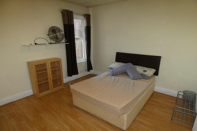 Bedroom One: Approx 13'3" x 11'9" UPVC double glazed window to side, radiator, wood laminate flooring, built in wardrobes, double bed and mattress, unit and fan.