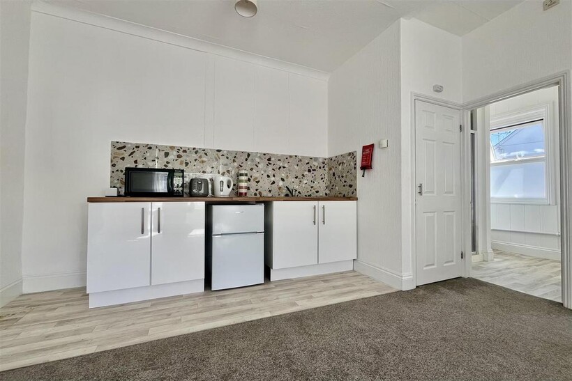 First Floor Office/Workspace - 5.77m x 5.03m max (18'11" x 16'6" max) - Three double glazed windows to the side elevation. Further double glazed window to the rear. Ceiling mounted light fitting. Data and power points. Rolled edge work surface with inset stainless steel sink and drainer, hot and cold mixer tap over. Ornate splash back. Under counter storage. Fridge Freezer. Kettle, microwave and toaster. Smoke detector. Storage cupboard housing boiler with slatted shelving. Door leading to