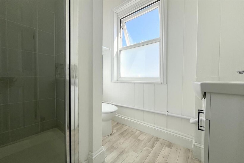 Bathroom - 1.75m x 1.98m max (5'9" x 6'6" max) - Double glazed window to the rear elevation. Wooden effect flooring. Low level WC. Sink unit with hot and cold mixer tap. Shower cubicle with riser bar, shower hose and head. Ceiling mounted light fitting.
