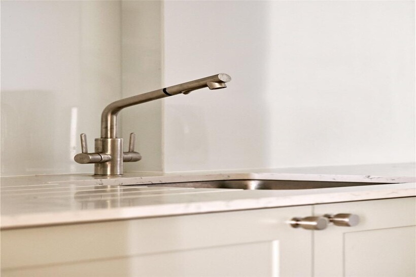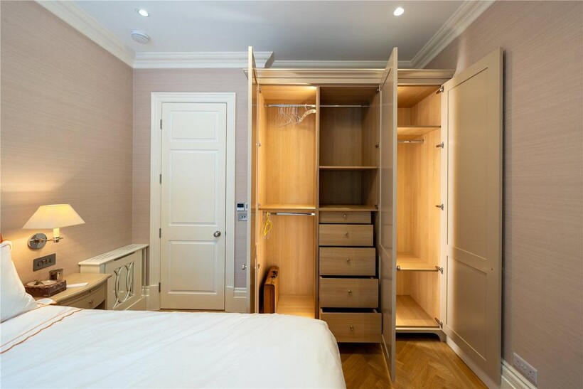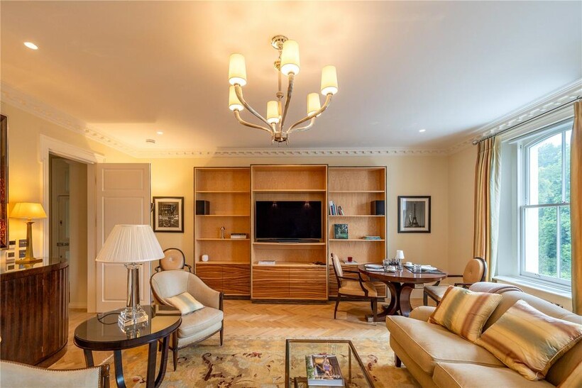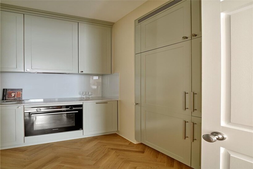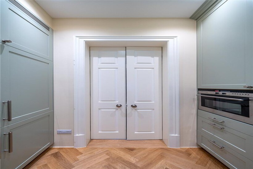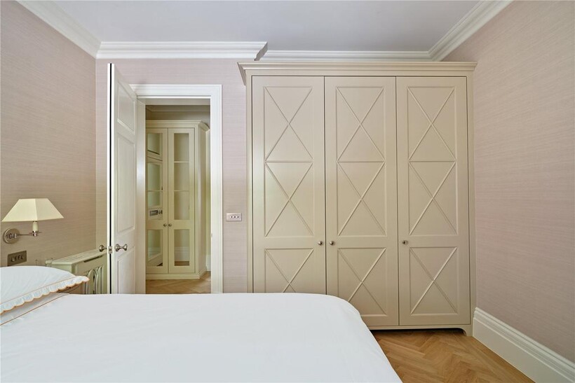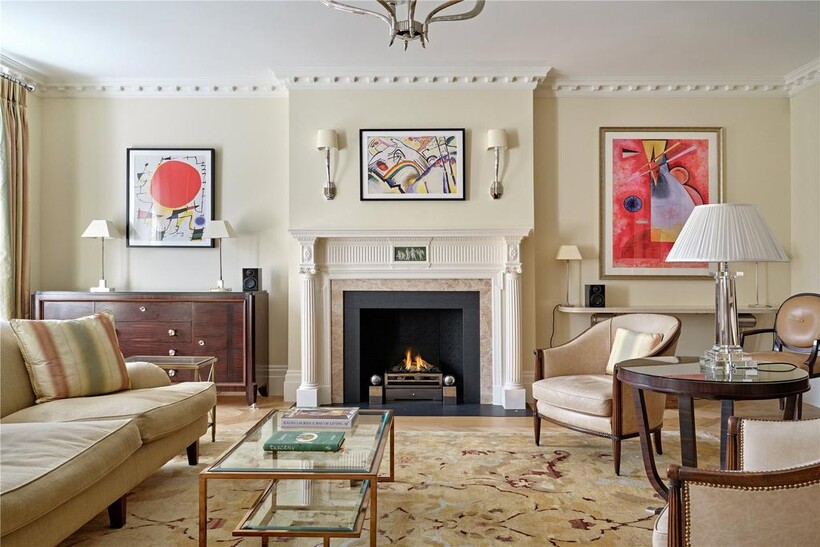 The property has a spacious reception room that features large windows, classical "modillion-block" plaster cornice mouldings, and a restored fireplace with an Emperador marble surround. The flat boasts custom-made furniture and a built -in zebra wood wall unit with a LED TV to complete the sophisticated space.