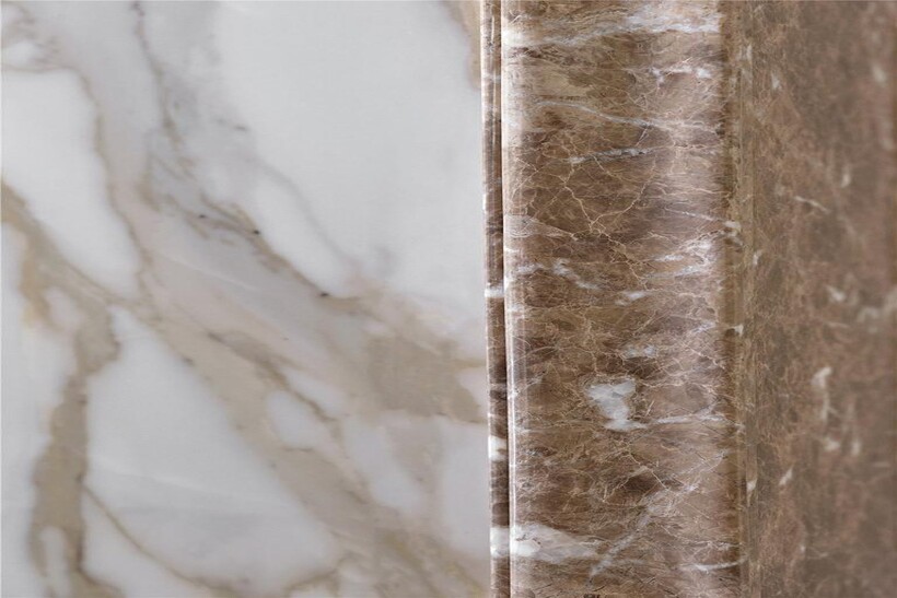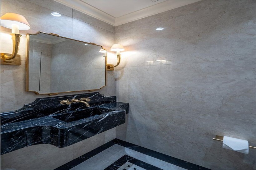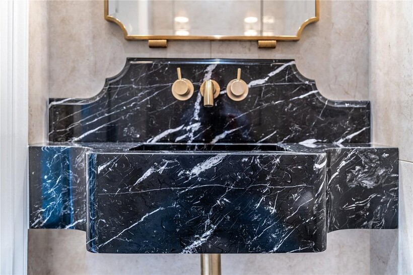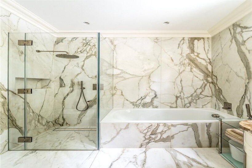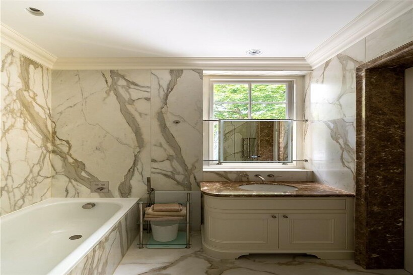 The en-suite bathroom features book-matched Calcatta d'Oro slabs, a soaking tub, glass- enclosed shower, Bagno Design brushed nickel fixtures, and underfloor heating. The vanity unit, with an Emperador marble top, is positioned in front of a large window for ample natural light.