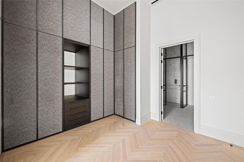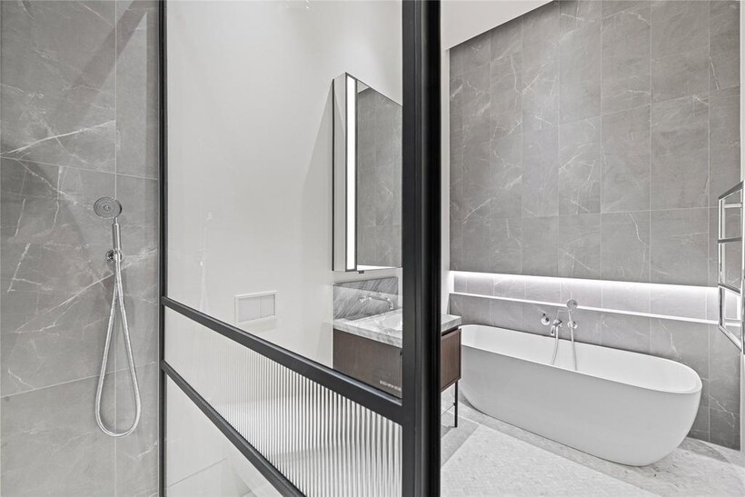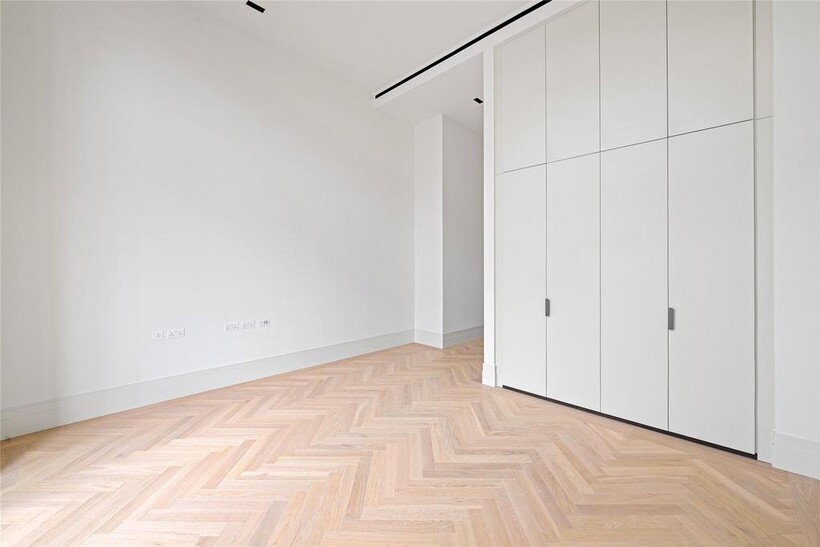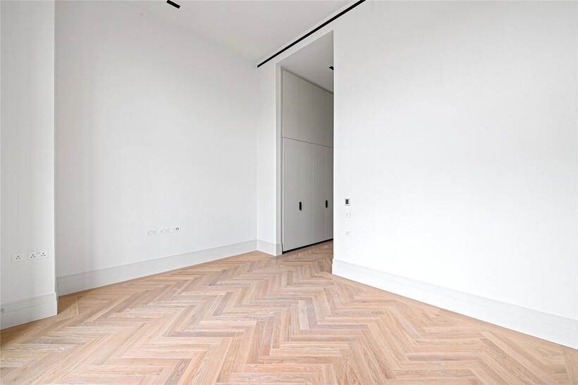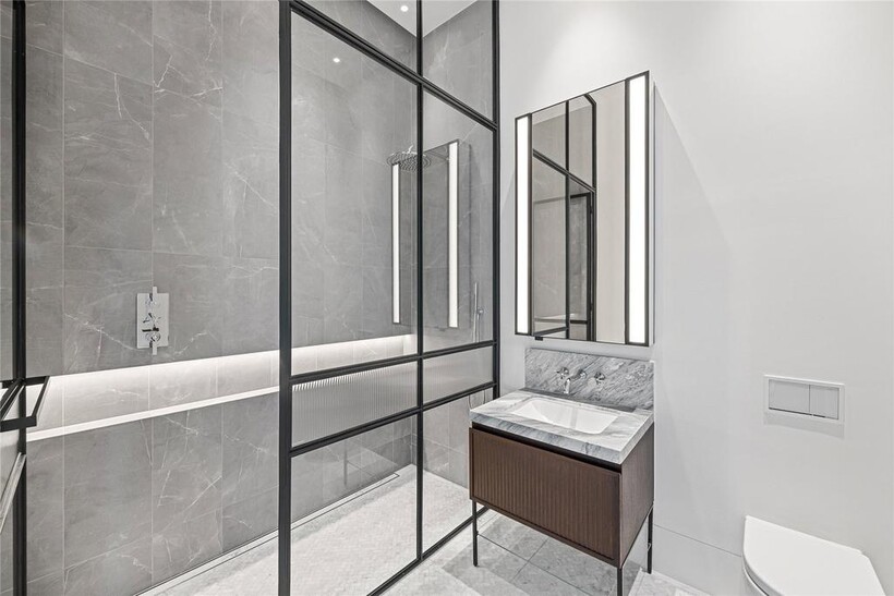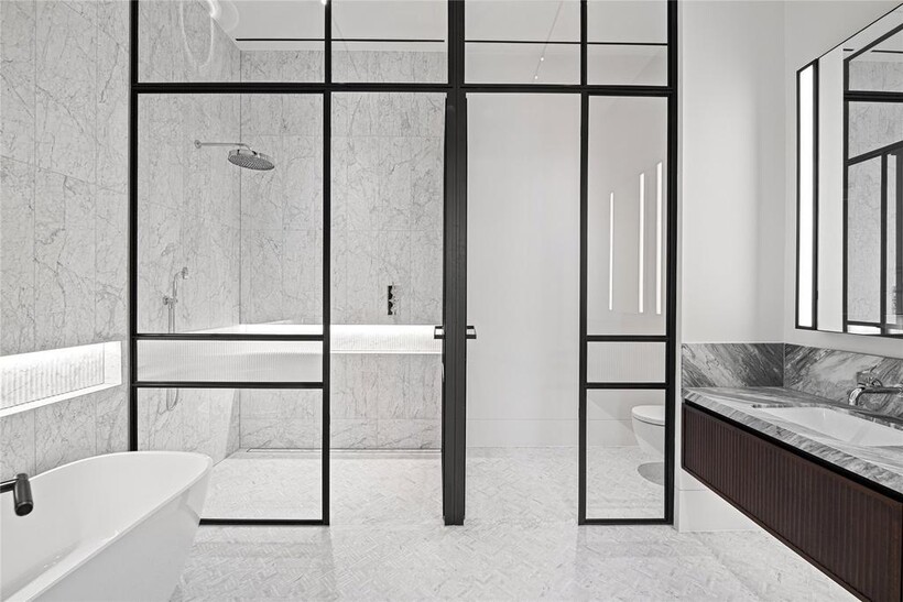There are two further generously sized double bedrooms, each with large windows and bespoke built-in storage and ensuite bathroom elegantly marble clad with refined fixtures and underfloor heating.