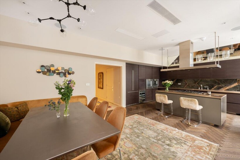 This impressive, spacious apartment has been interior designed throughout and boasts four generous bedroom suites with the principal benefitting from a plethora of built-in wardrobes and additional walk-in dressing room. Positioned centrally on the lower level is the bespoke kitchen which provides a wide range of cabinetry and integrated appliances, this room has ample space for dining and leads out to the private patio. Found on the ground floor is the spectacular reception room with ceiling height in excess of four metres and views across/direct access to the landscaped residents gardens.