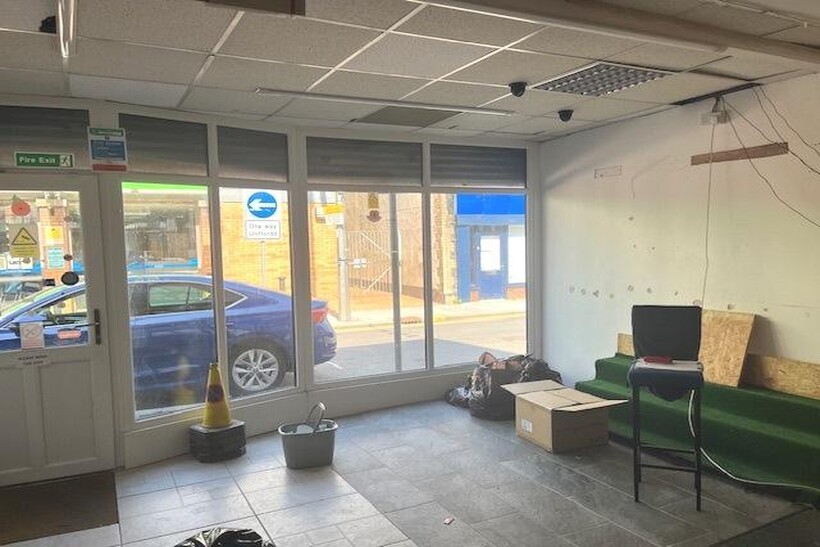 GROSS FRONTAGE; 5.18m (17ft ) modern display window shop front with a security roller shutter.