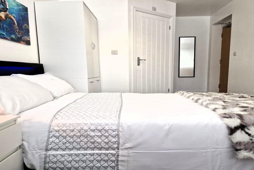 The room is located on the ground floor of the property and has been designed to a very high standard. As the room is of a very large size. The room also comprises of a double bed, bedside cabinet, wardrobe, desk, mirror and TV. This room allows plenty of natural light due to its big windows.