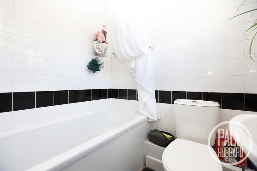 Bathroom - 1.73 x 1.60 (5'8" x 5'2") - Tile flooring & walls, UPVC double glazed obscure window to the side aspect, extractor fan, suite comprises a toilet, wall mounted wash basin with hot & cold taps, a panelled bath with hot & cold taps and an electric shower set above.