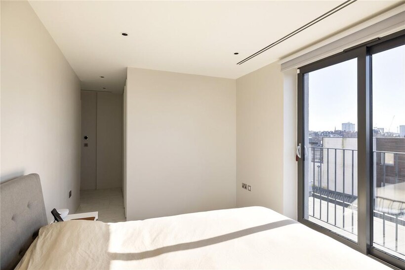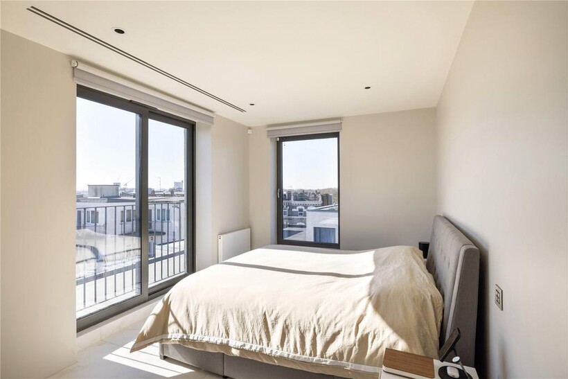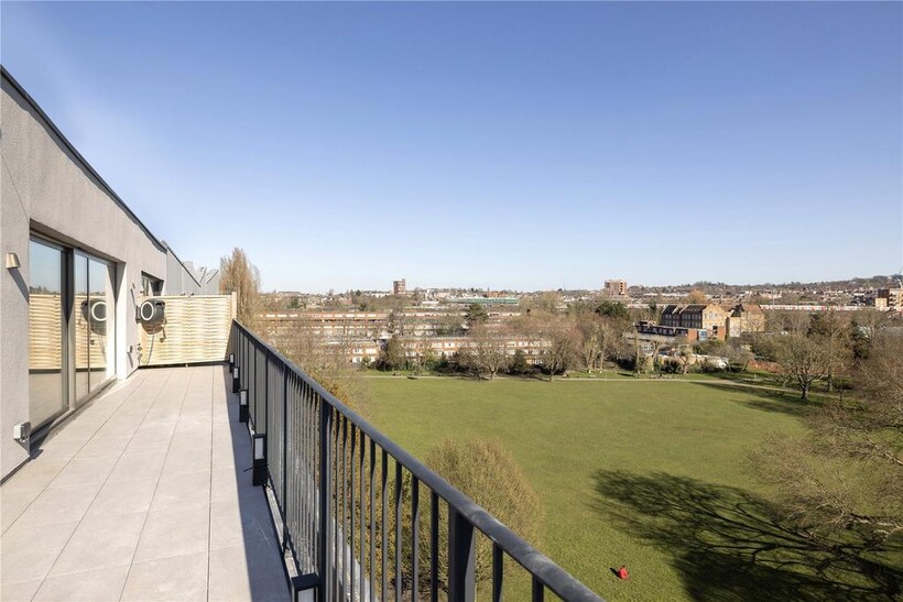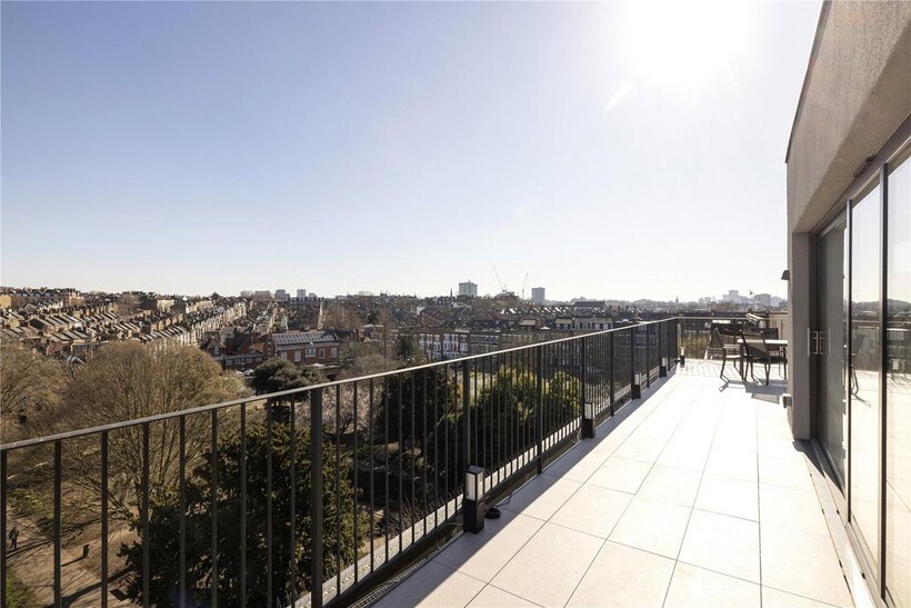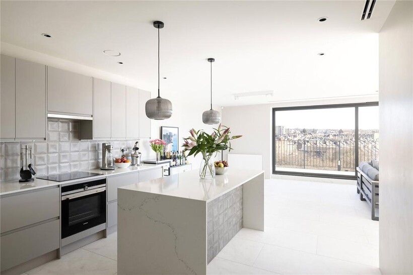 Poised atop Northwest London's skyline, this exquisite 5th-floor penthouse redefines contemporary luxury with 1,325 sq ft of fluid, impeccably designed living space. Elevated even further by an expansive 600 sq ft southeast-facing terrace, this residence commands unrivalled panoramic views, sweeping across lush parks, charming suburbia, and London's most iconic landmarks.Upon entry, a central corridor anchors the home, flanked by discreet, integrated storage. There is an immediate sense of flow and connectivity, enhanced by porcelain tiles and whispering grey accents that stretch effortlessly throughout. Architecturally sharp yet instinctively liveable.