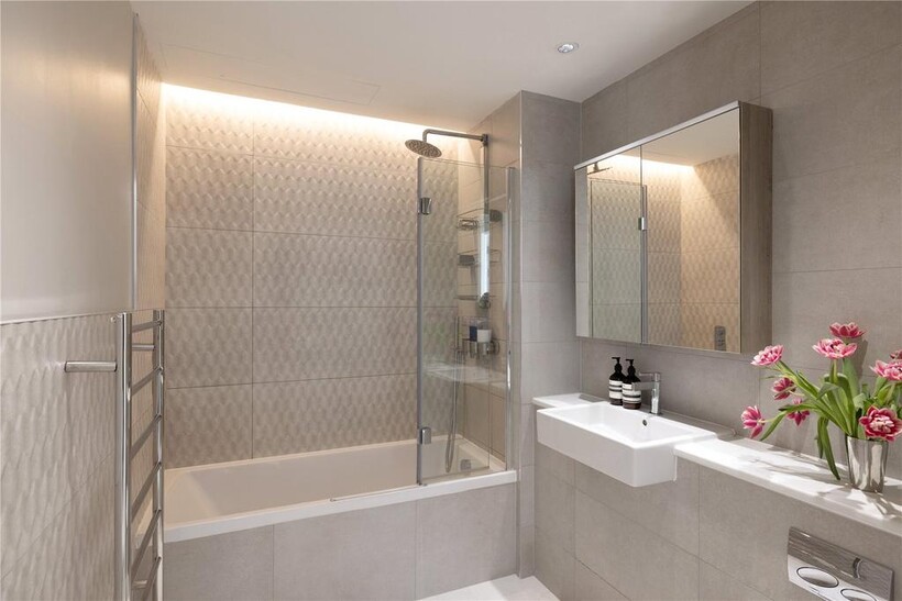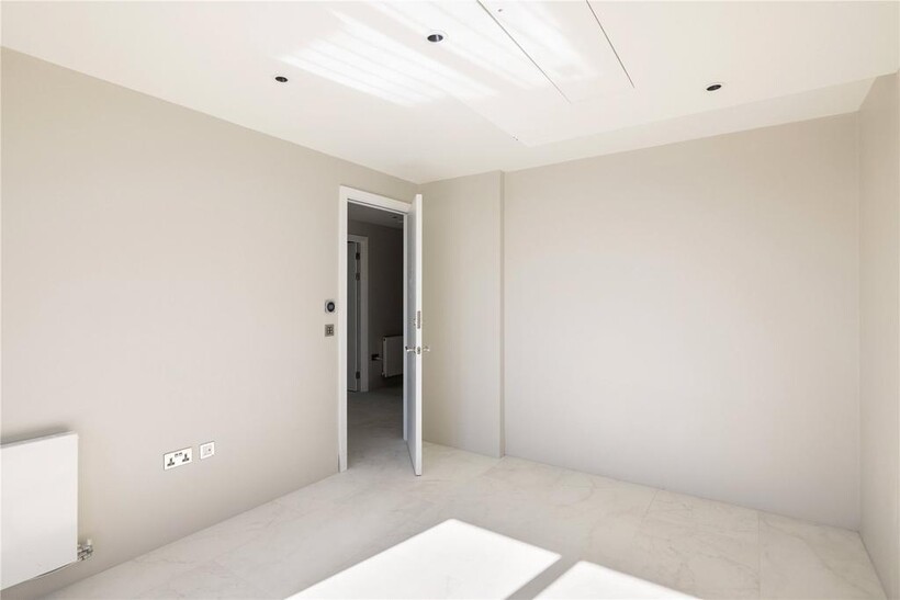 Each of the three bedrooms is a light-filled retreat, framing its own exclusive portrait of the London skyline. A living canvas of movement and light, the city reveals itself differently from every angle, making each space an experience of its own. The primary suite exudes effortless sophistication, complete with a sexy en-suite shower room, where ribbed charcoal tiles of natural stone impart a volcanic sensuality. Throughout, the interior’s cool, neutral hues echo the crystalline palisades of the Mediterranean, offering a calculated balance of serenity and bold modernity.