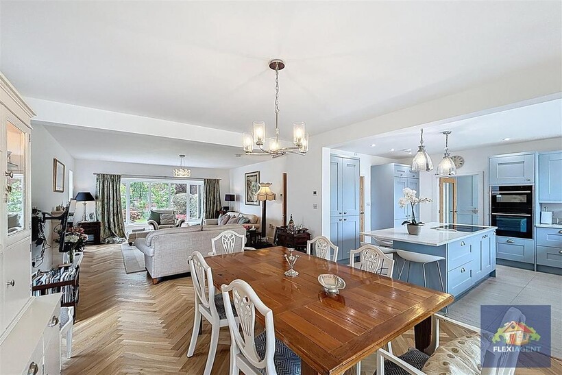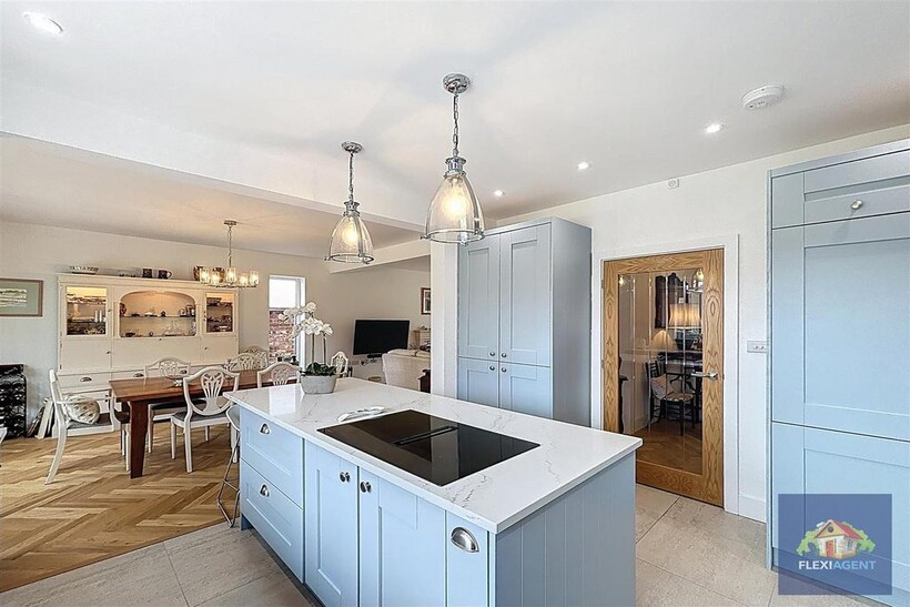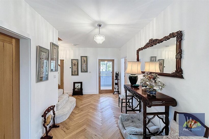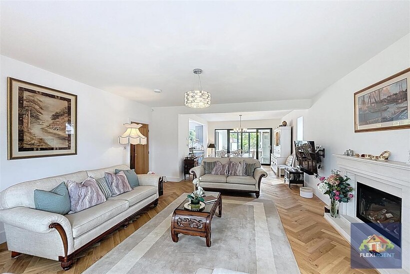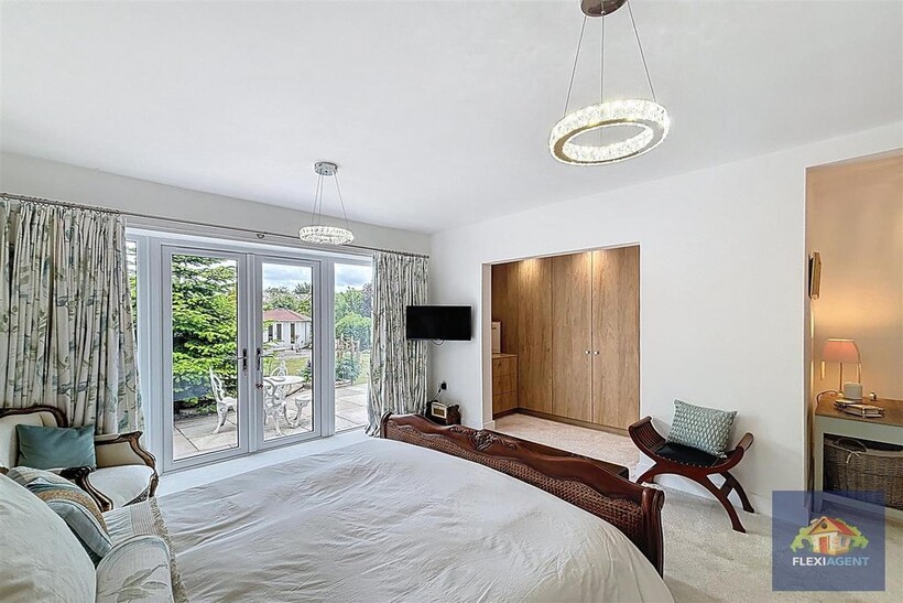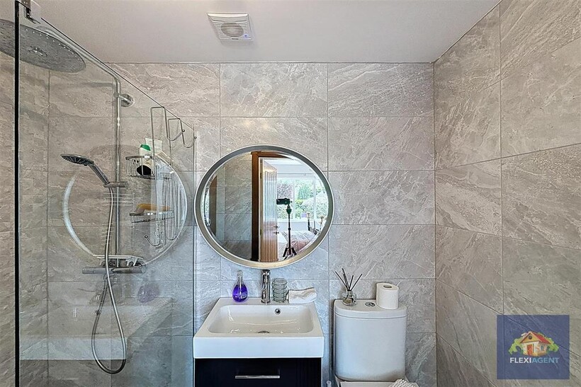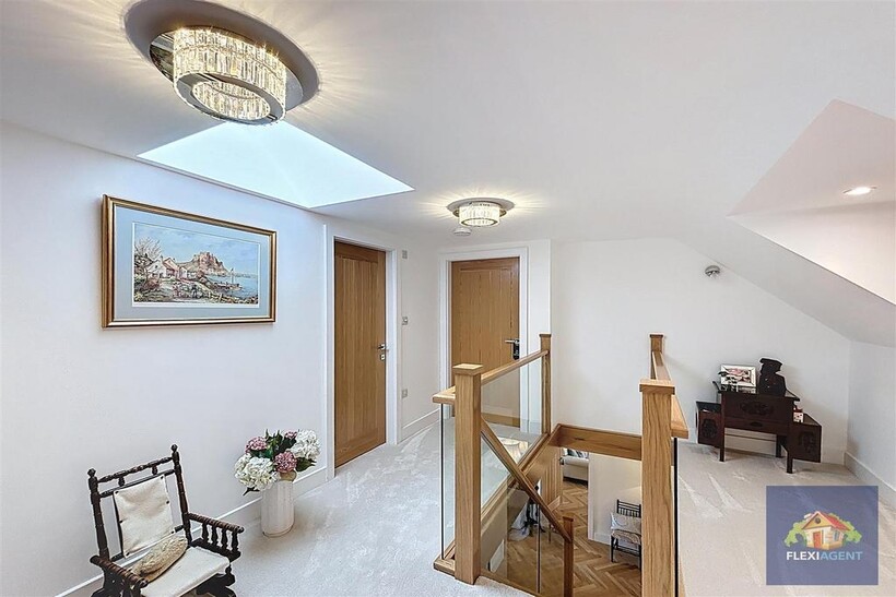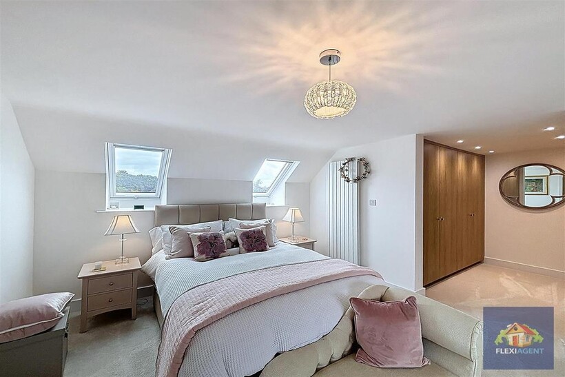 The ground floor welcomes you with a spacious entrance porch and airy hallway, leading to a contemporary kitchen fitted with top-of-the-range appliances and marble worktops. The heart of the home is the open-plan lounge and dining area, featuring a beautiful bay window that frames the charming garden at the front of the house and fills the space with natural light. To the rear, a stunning sunroom with a large skylight provides a bright and airy living space, offering access to the expansive landscaped rear garden. This floor also hosts two generous double bedrooms, each with its ensuite shower room—one boasting a walk-in wardrobe, while the other features built-in wardrobes for convenient storage. A utility room and a downstairs WC complete the ground floor.