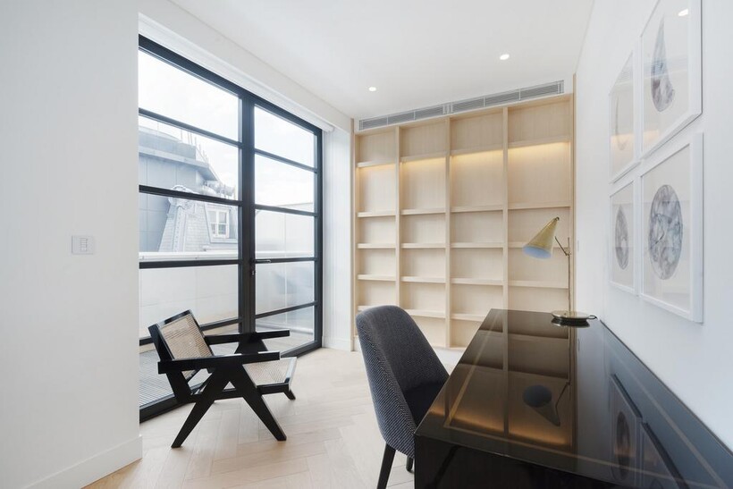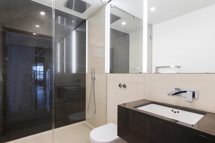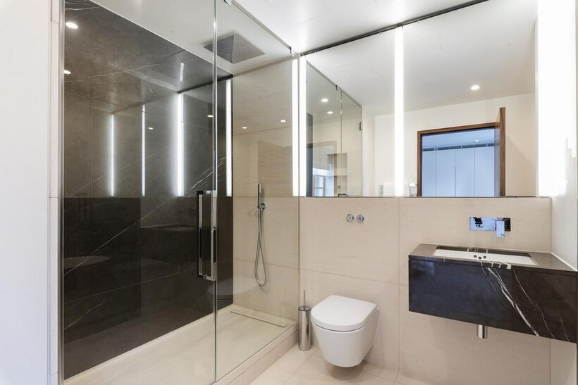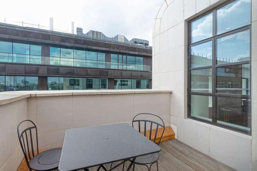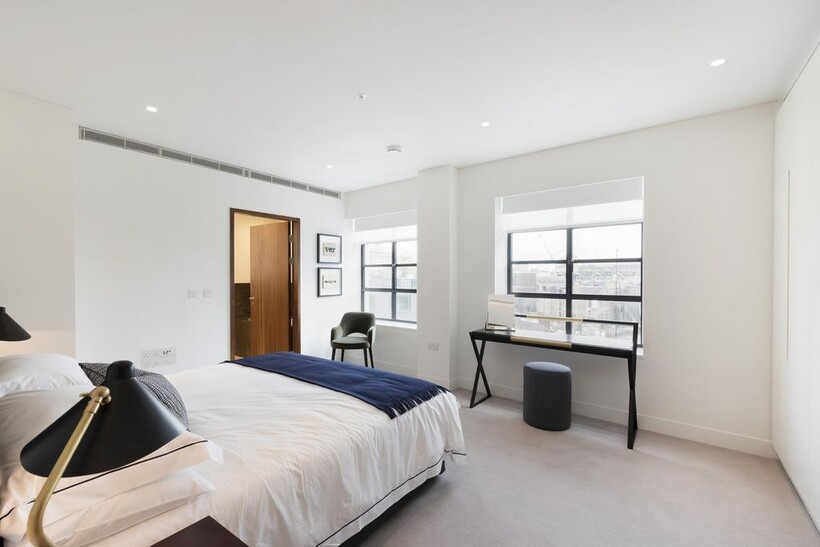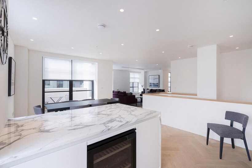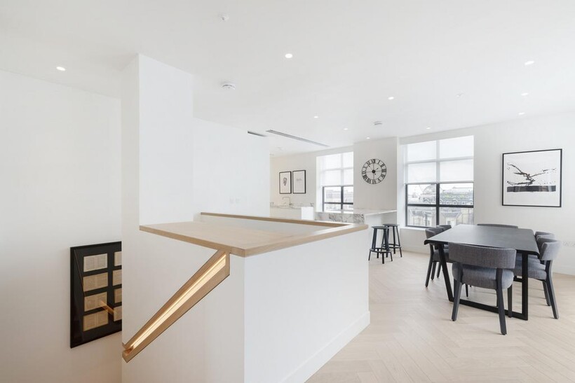 This apartment, located on the 7th and 8th floor (with lift) boasts three spacious double bedrooms when you enter on the 8th floor. The master bedroom has a generous walk in wardrobe, ensuite bathroom and beautiful terrace leading out from it. The other two bedrooms contain ample storage, both with their own en-suite bathrooms. The 7th floor leads into an extremely bright and spacious reception room with a huge terrace and stunning views across Central London. There is also an additional study area/snug leading off the reception room. The large open plan living room is complete with a bespoke and fully fitted kitchen with state of the art integrated appliances.The apartment is fully furnished using interior designed furniture and has incredibly high ceilings.