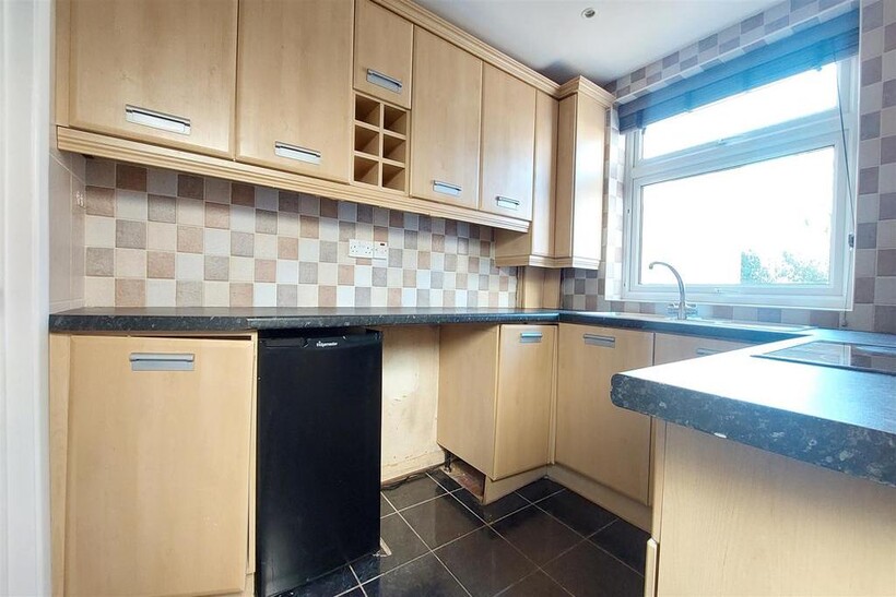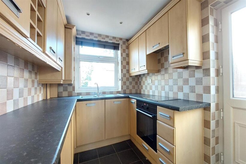 Kitchen - 2.72 x 2.43 (8'11" x 7'11") - Tiled flooring and tiled walls. A variety of wall and base kitchen units with silver handles, stainless steel sink, half bowl and draining board. UPVC double glazed window, integrated electric oven, hob and extractor hood and and wooden panelled door with chrome handle, uPVC double partially glazed rear door leading to the driveway,