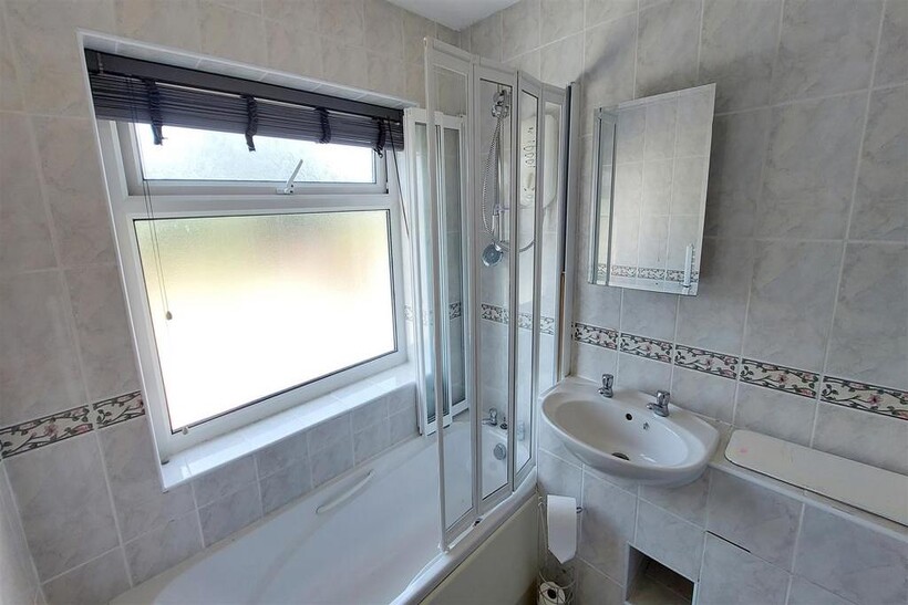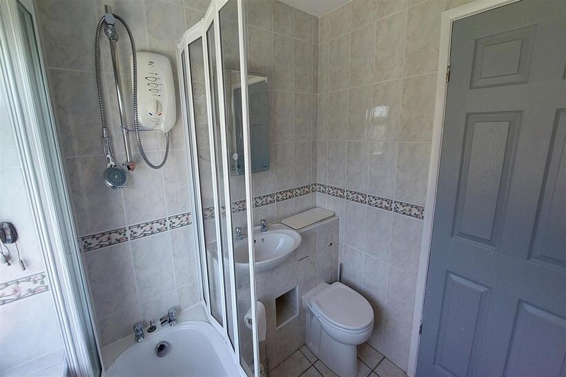 Family Bathroom - Having contemporary three piece suite comprising; wall-mounted wash hand basin and low flush wc with hidden cistern, panel bath with Mira electric shower over with bi fold glass shower screens, fully ceramic tiled walls, recessed spot lights to ceiling, ceramic tiled flooring, ceramic heated towel rail and Upvc opaque double glazed window to the rear aspect.