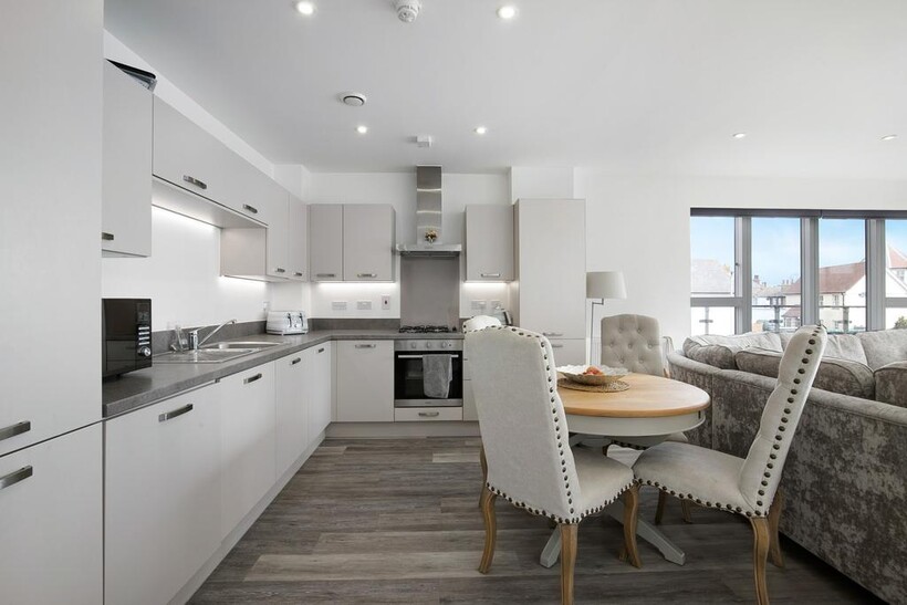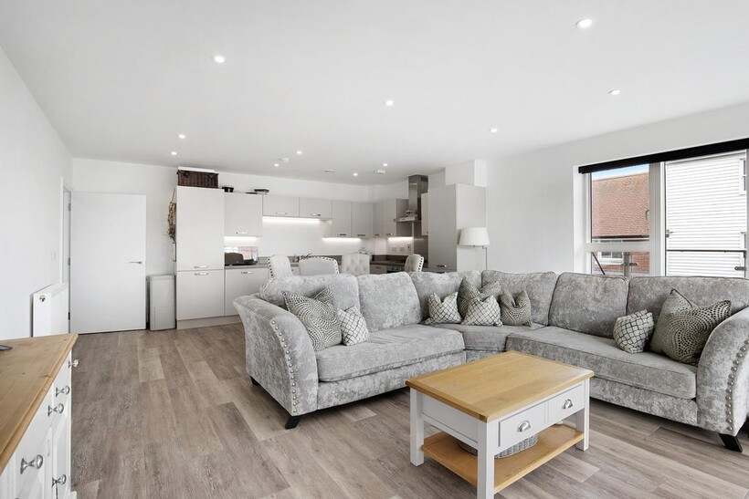 The living area and kitchen are open plan in their layout. The living area has wrap around floor to ceiling windows with a corner balcony offering views from both angles.