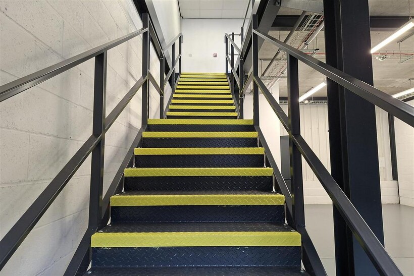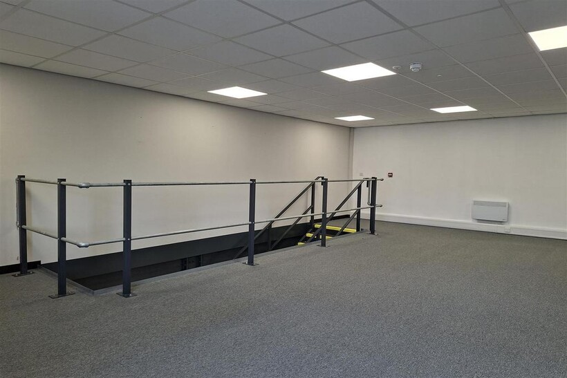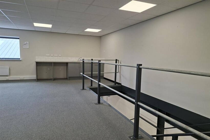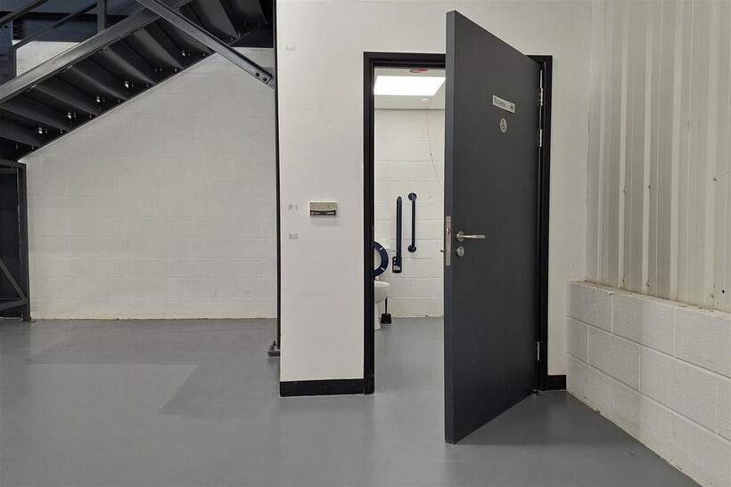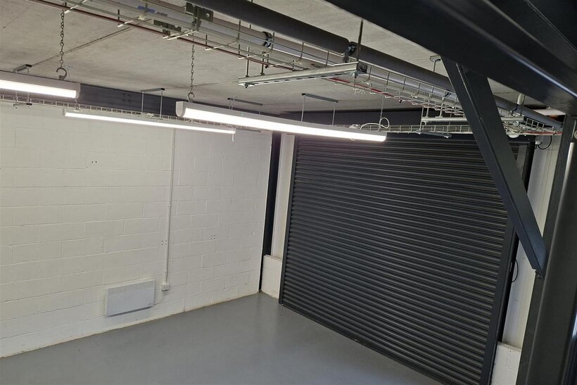 Internally the ground floor offers painted concrete flooring, 3 phase electrics, modern programmable electric panel heating, broadband and LED lighting, Fire Alarm system and W.C. with disabled access, hot water heater and emergency assist alarm. Access via a personnel door, with 10ft x 9ft electric roller shutter door to the front of the unit. Minimum eaves height to mezzanine : 10.26 ft.