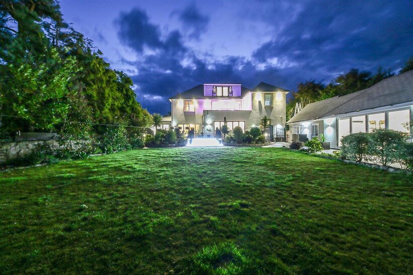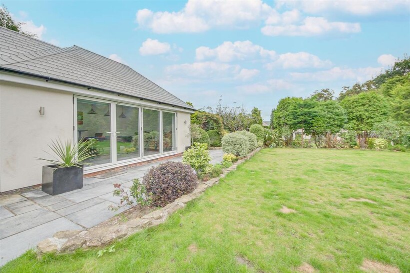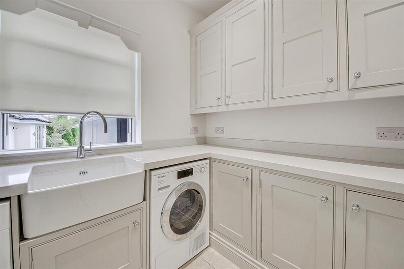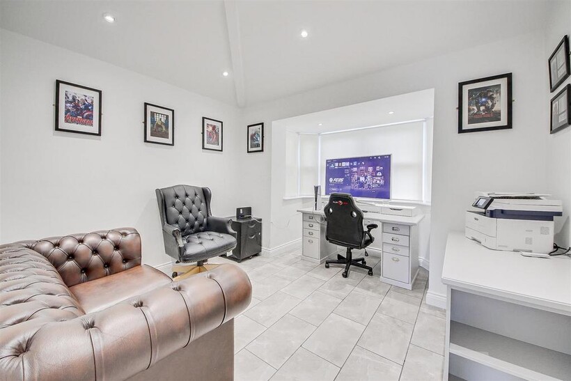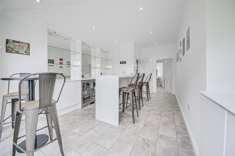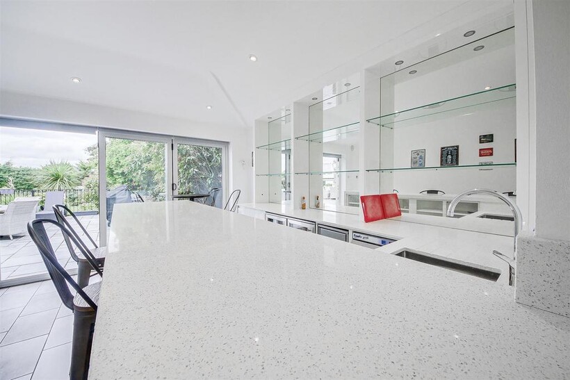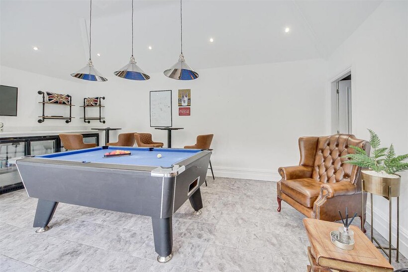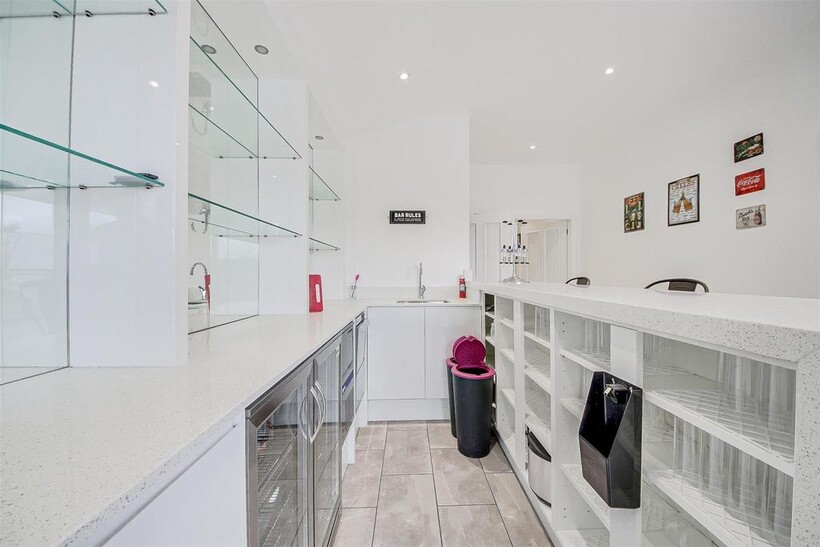 There is a large open-plan kitchen and dining area with bifold doors that open out onto the rear garden. A utility room and boiler room offer additional convenience. To the front, a spacious lounge also features bifold doors leading to the garden. The home includes a stylish bar area with bifold doors, a study room, and an additional WC.