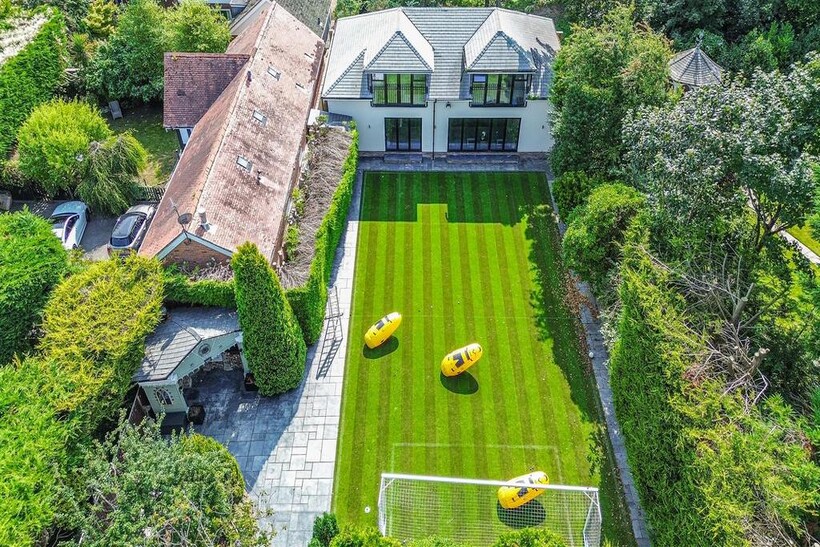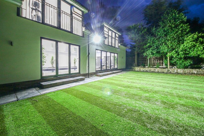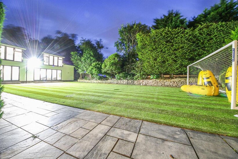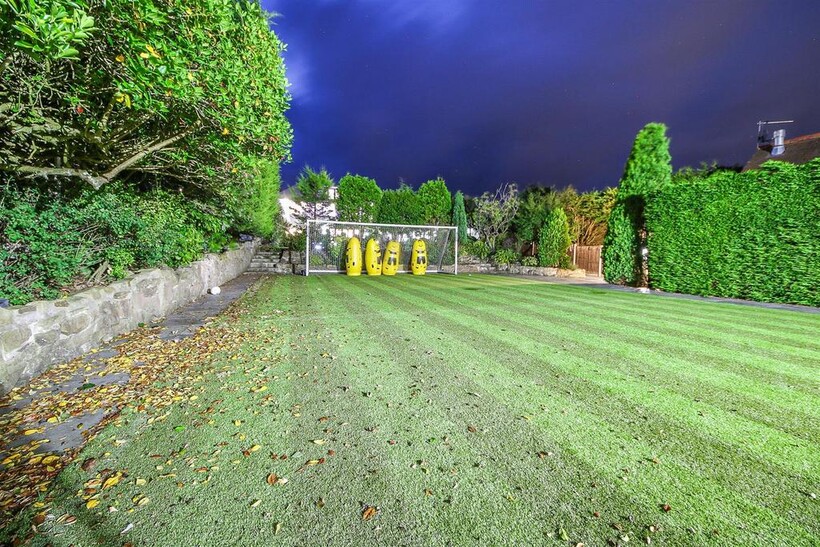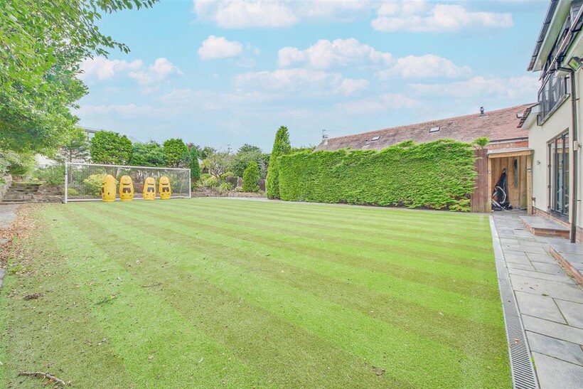 Sun catching rear garden, landscaped sports field & outdoor kitchen area, pizza oven