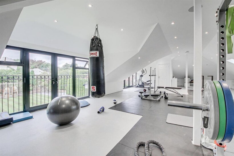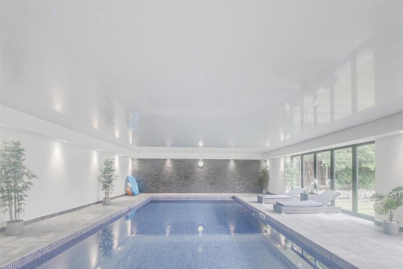 -A private indoor swimming pool complex with sauna, WC, boiler room, and stairs leading to a spacious gym area